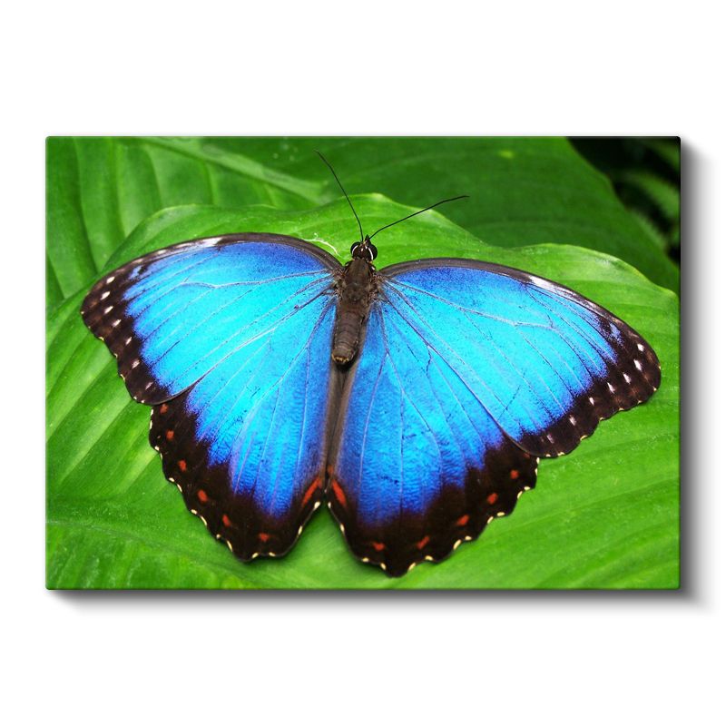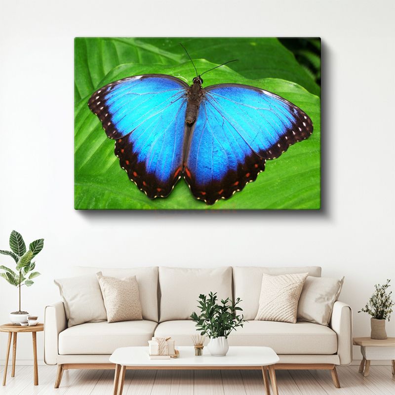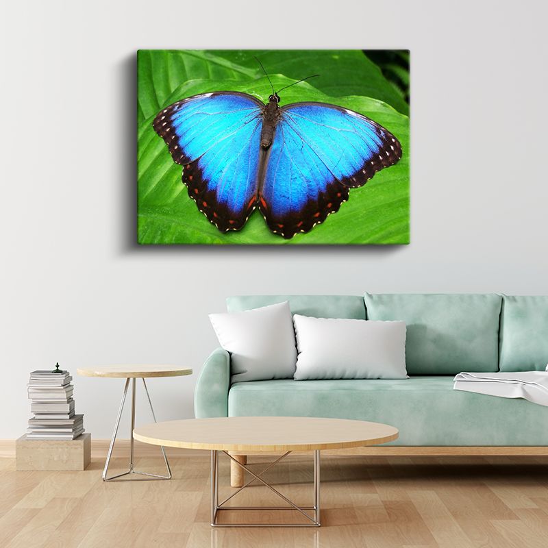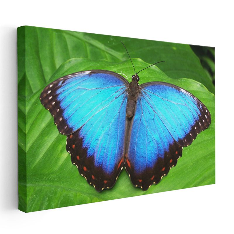Mavi Kelebek - Yaprak Üzerinde Göz Alıcı Kanatlar Kanvas Tablo