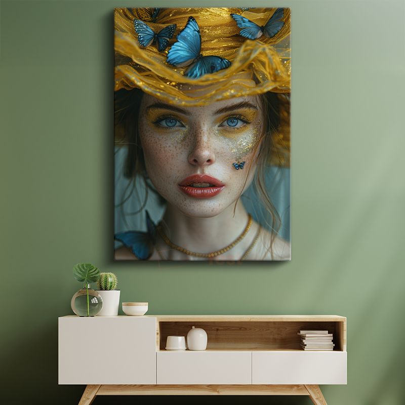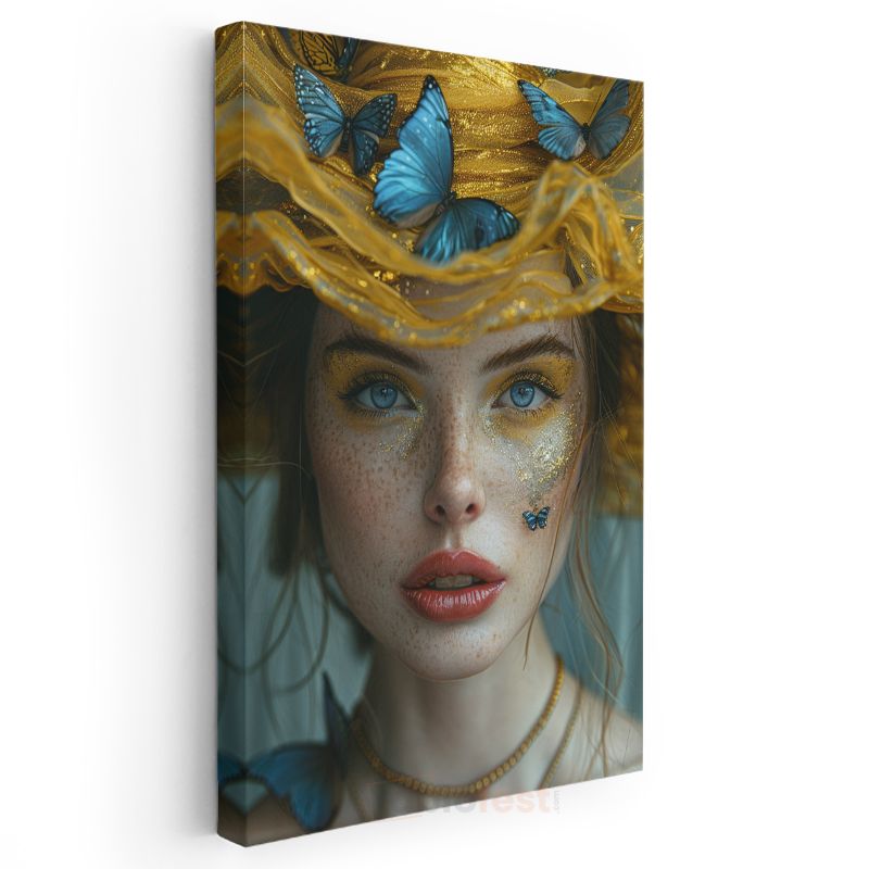 Mavi Kelebekler - Altın Işıltılar İçinde Büyüleyici Portre Kanvas Tablo