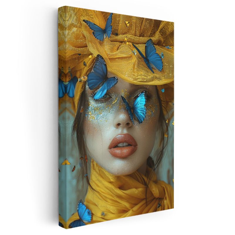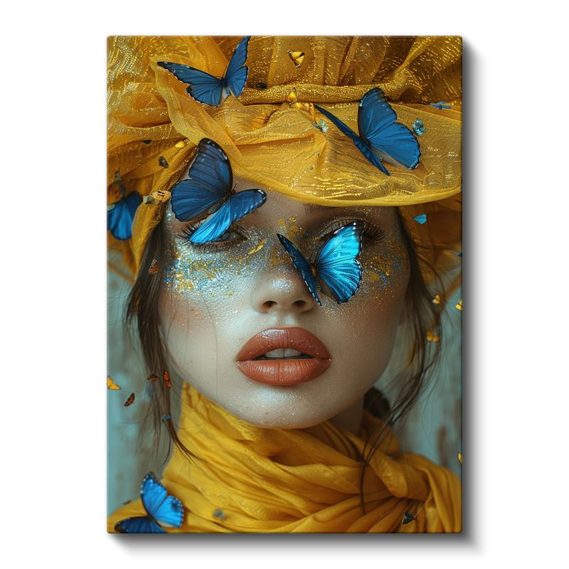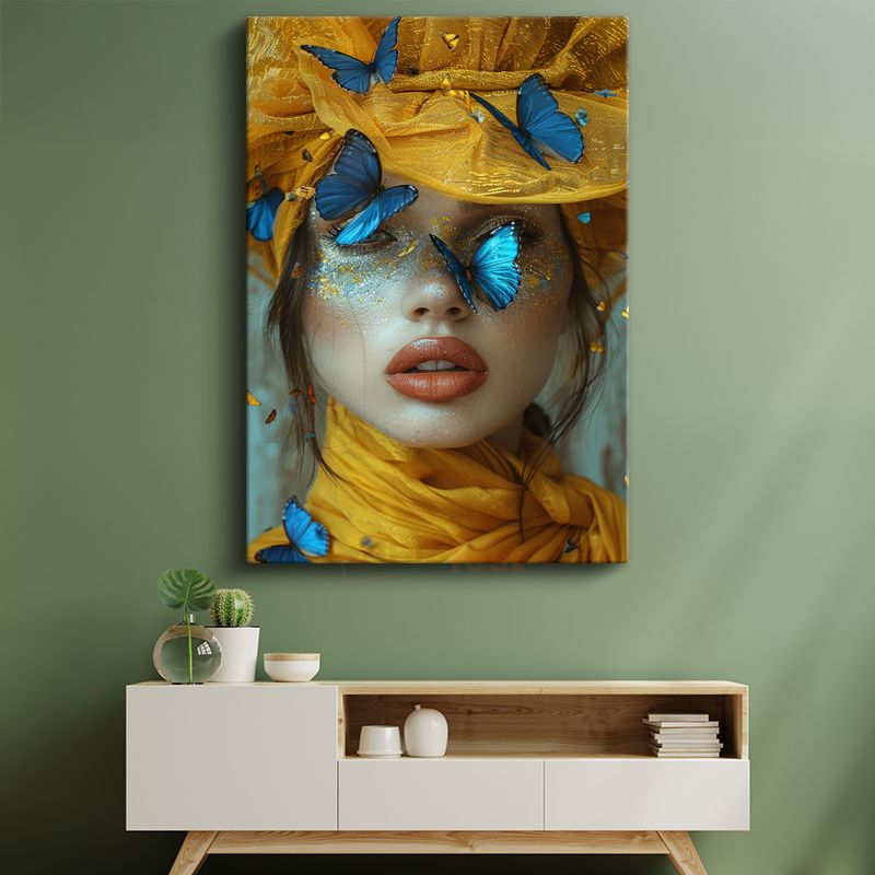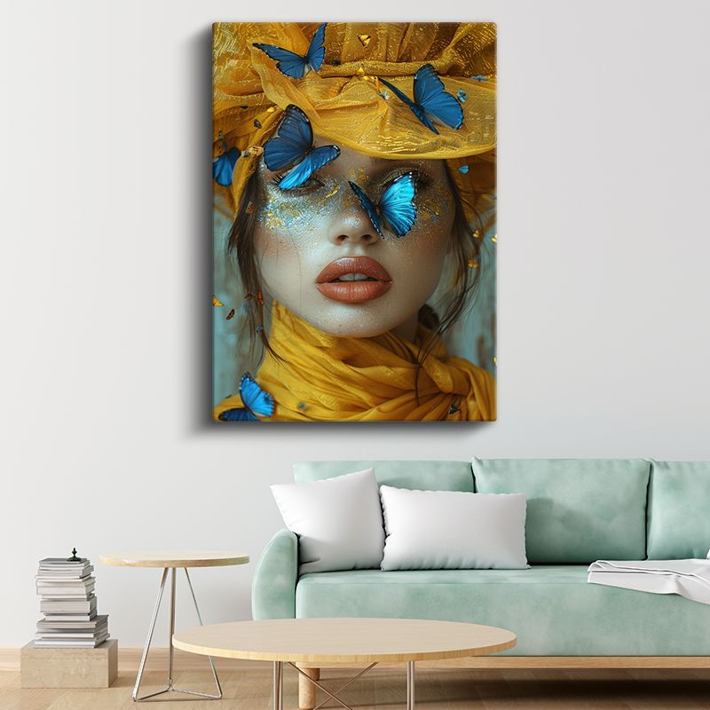 Mavi Kelebekler - Altın Sarısı Detaylı Portre Kanvas Tablo