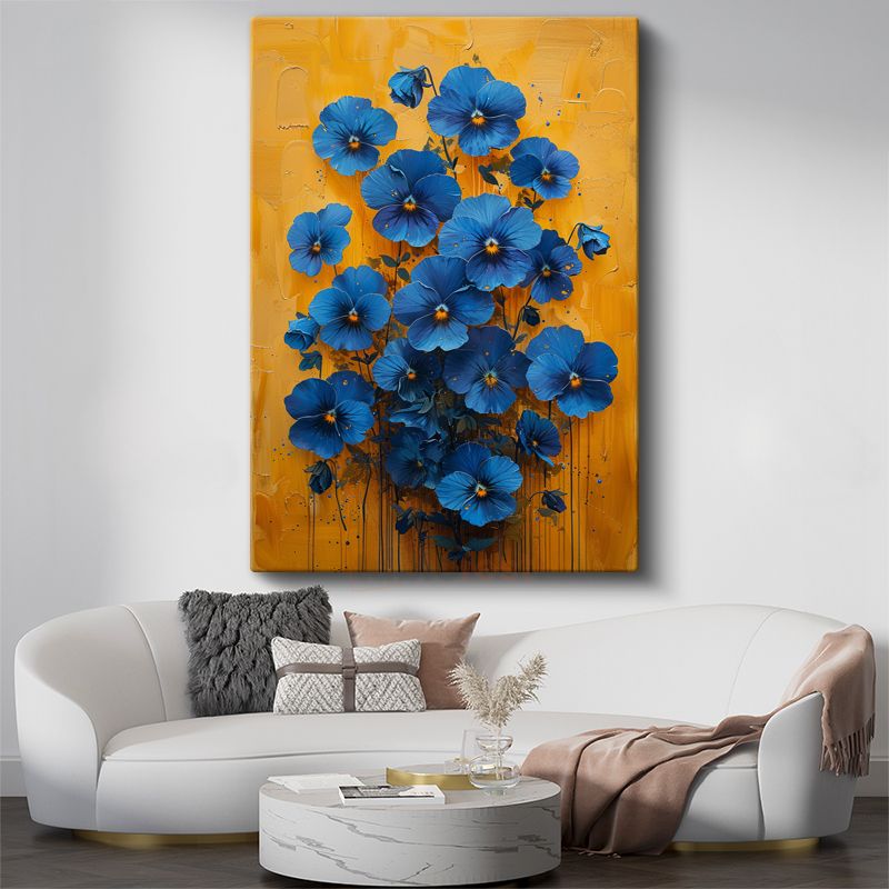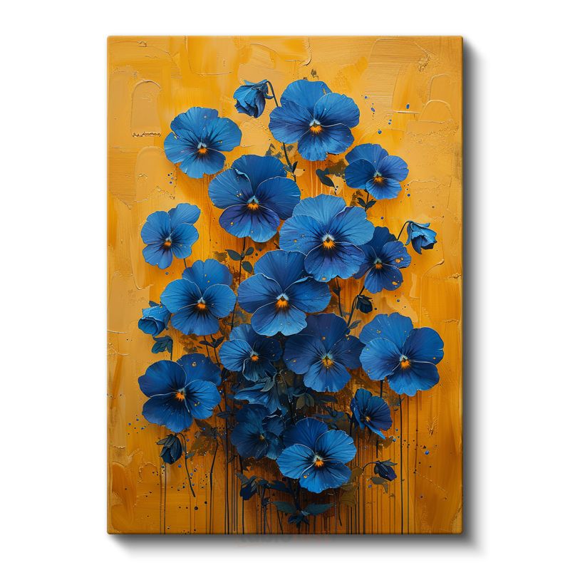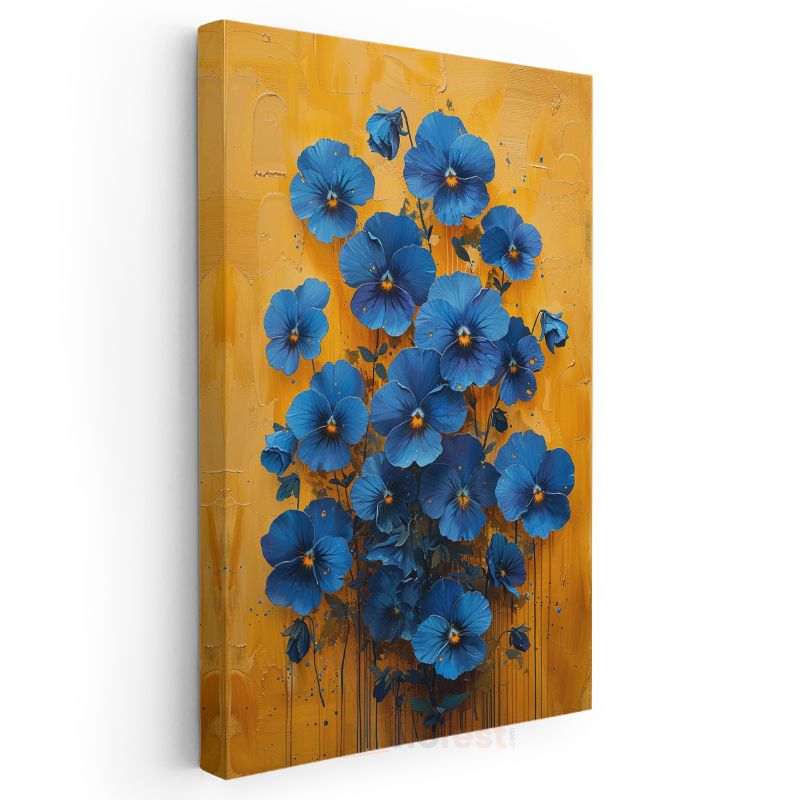 Mavi Menekşeler - Sarı Fon Üzerinde Kontrast Çiçekler Kanvas Tablo