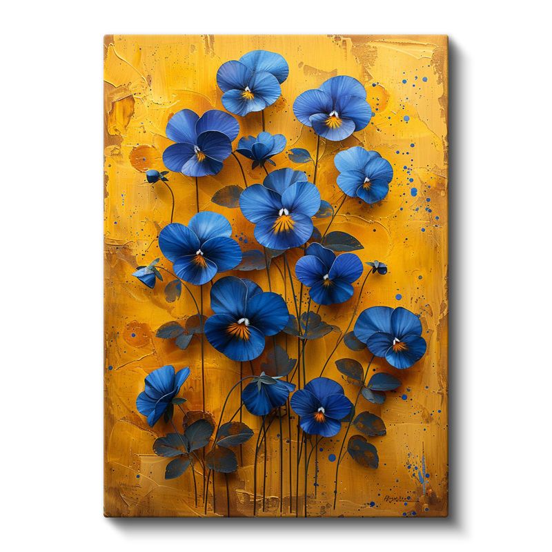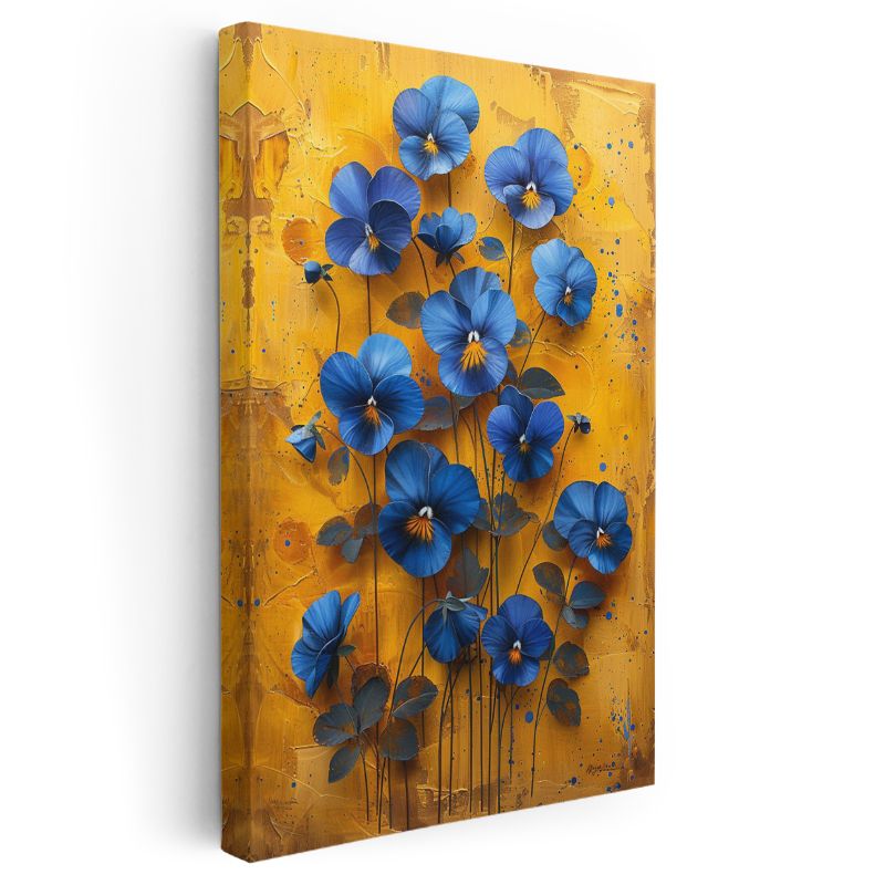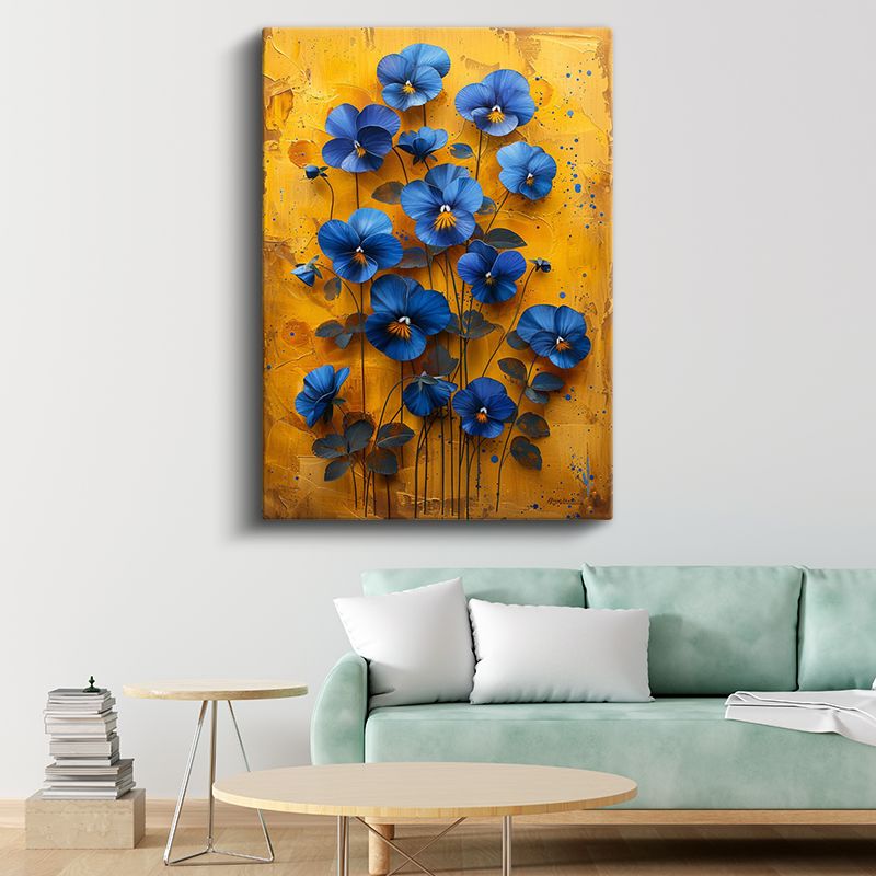 Mavi Menekşeler - Sarı Fonda Kontrast Çiçek Kanvas Tablo