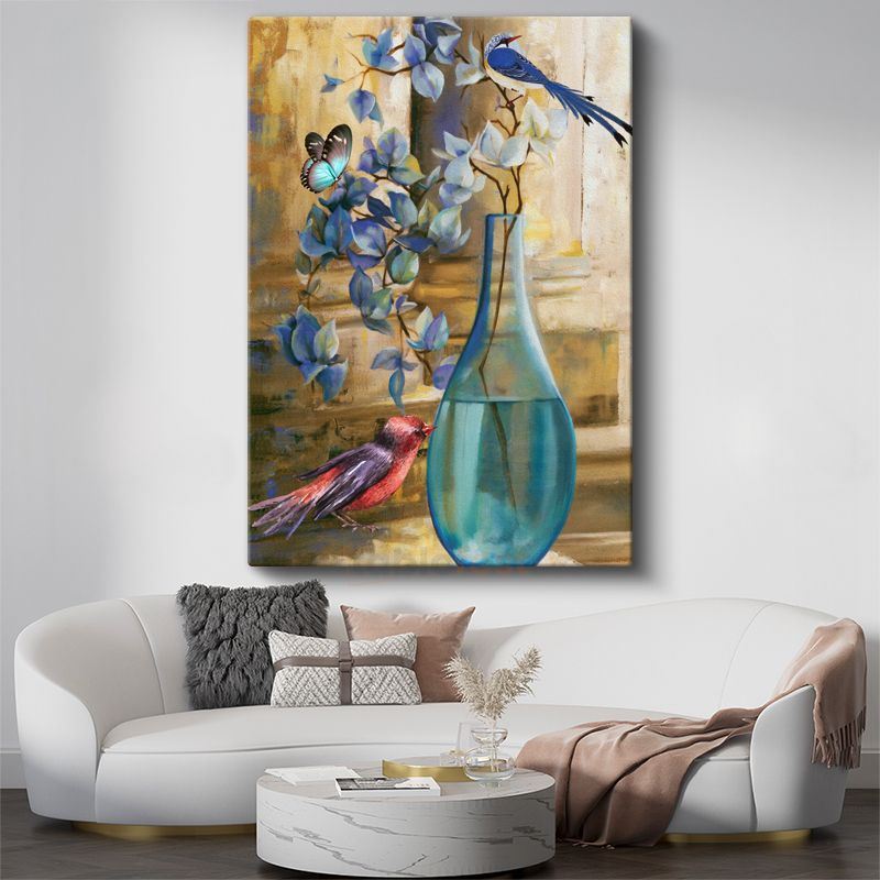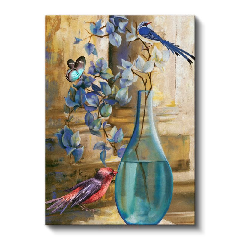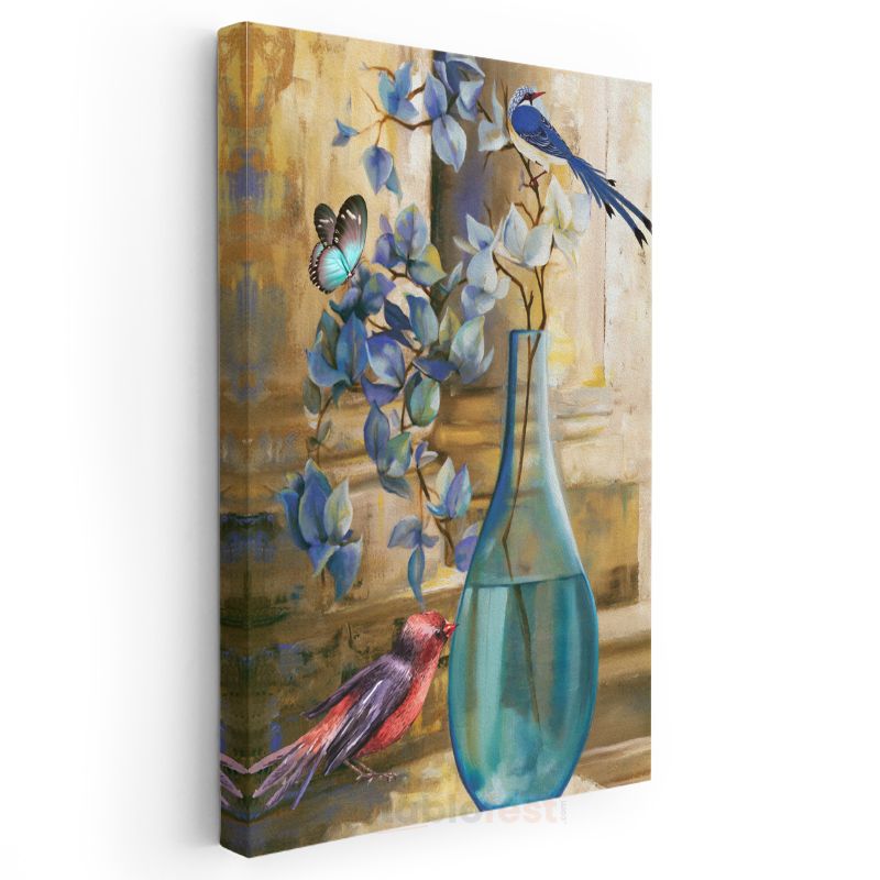 Mavi Orkide - Kuş ve Kelebek Detaylı Egzotik Çiçek Kanvas Tablo