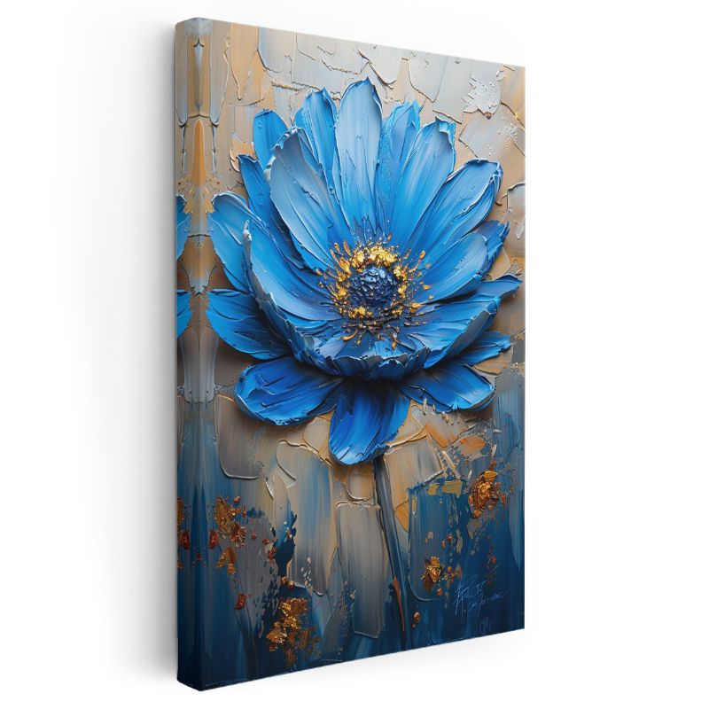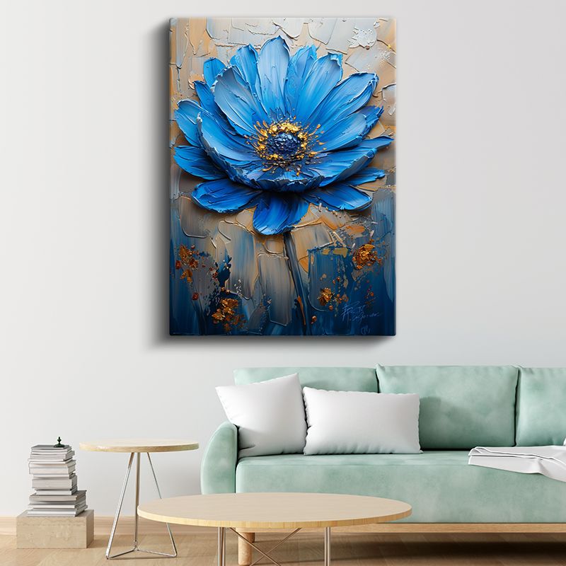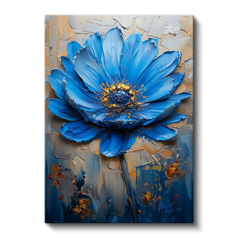 Mavi Papatya - Altın Detaylı İmpasto Tekniği Kanvas Tablo