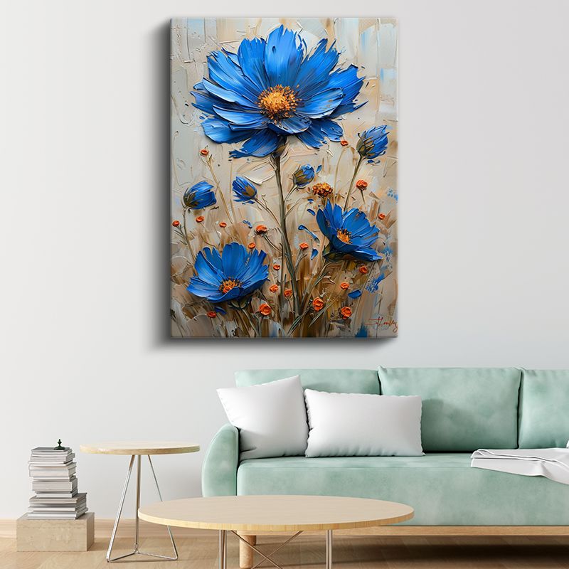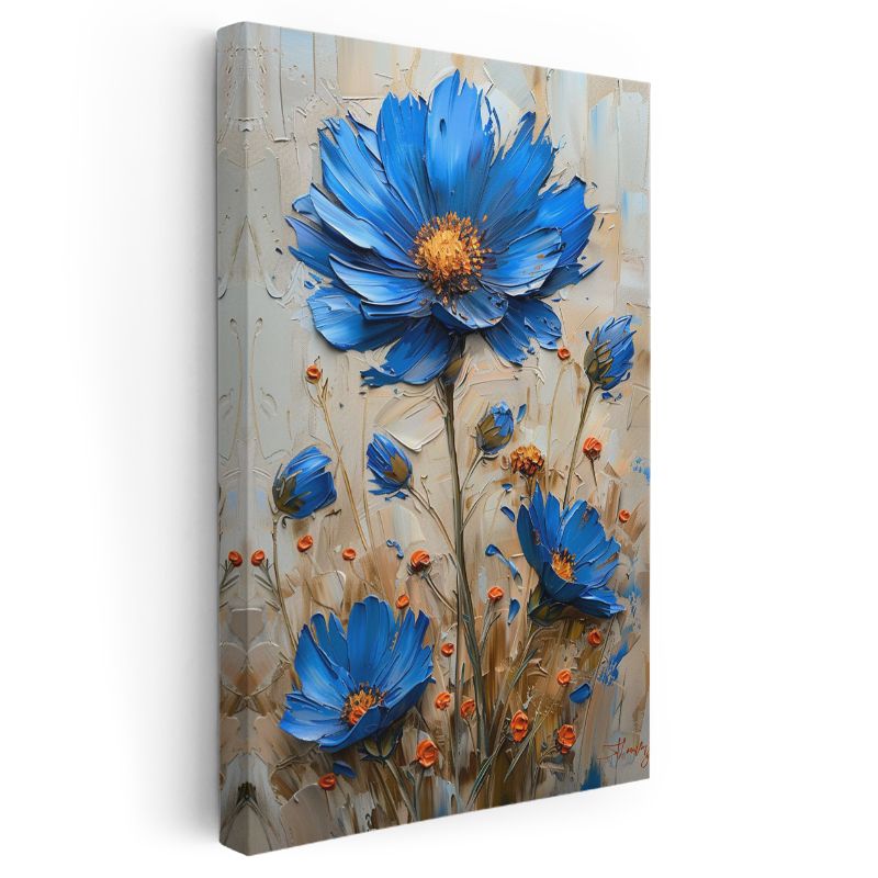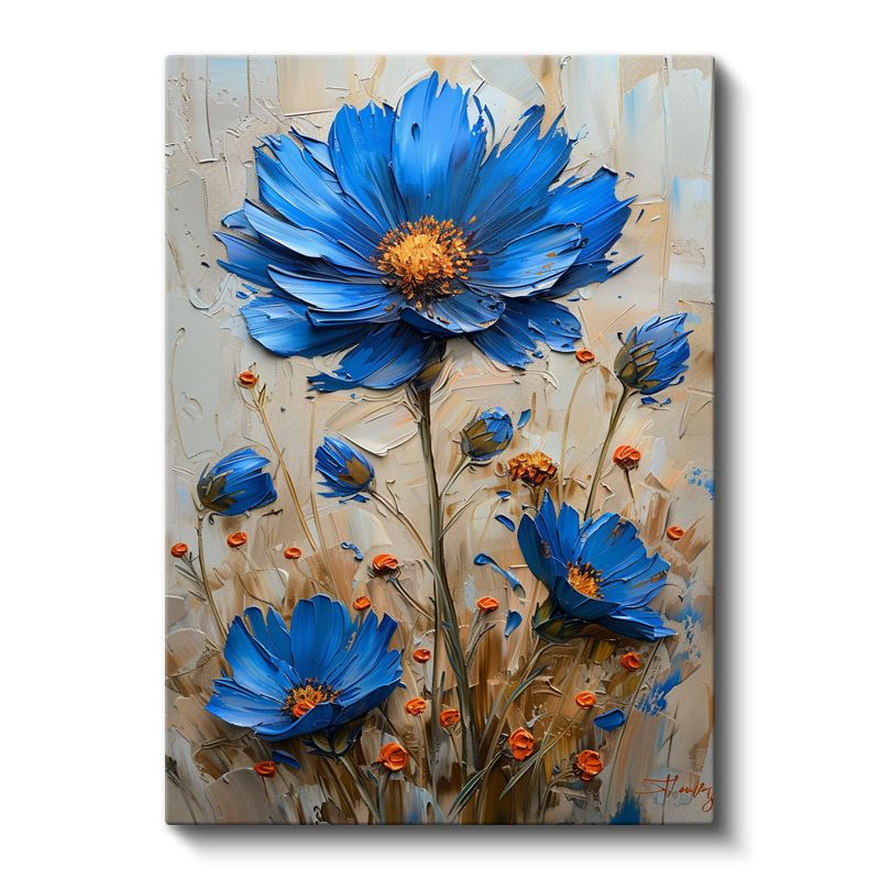Mavi Papatyalar - Kabartma Görünümlü Çiçek Kompozisyonu Kanvas Tablo