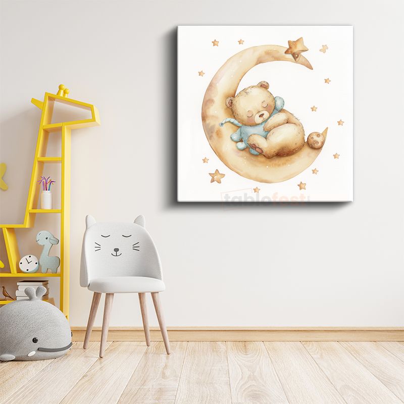 Mavi Pijama Ayıcık - Ay Üzerinde Tatlı Rüyalar Kanvas Tablo