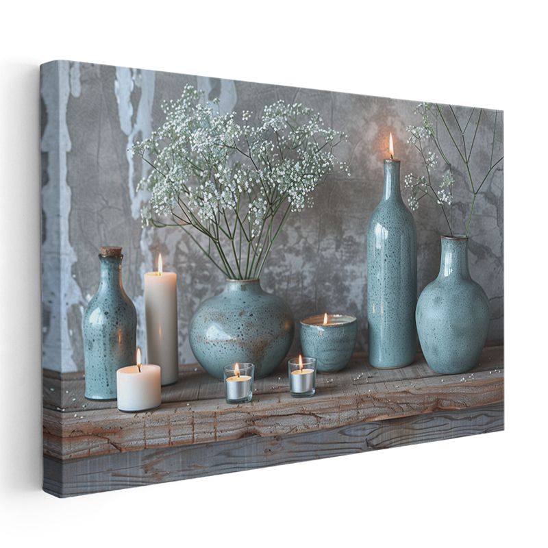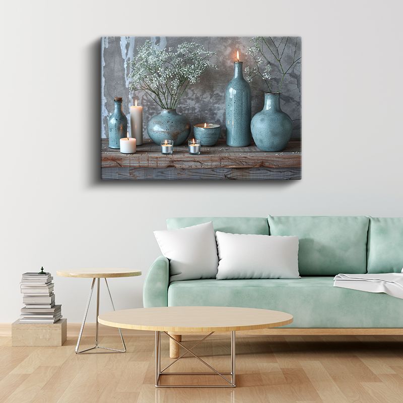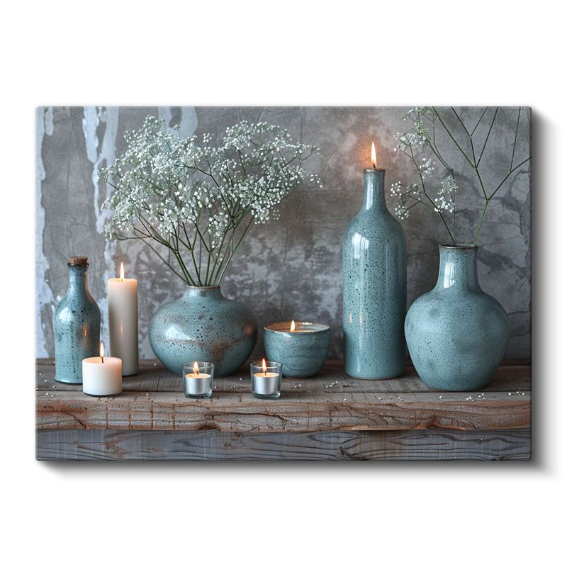 Mavi Seramik - Beyaz Çiçekler ve Mumlar Kanvas Tablo