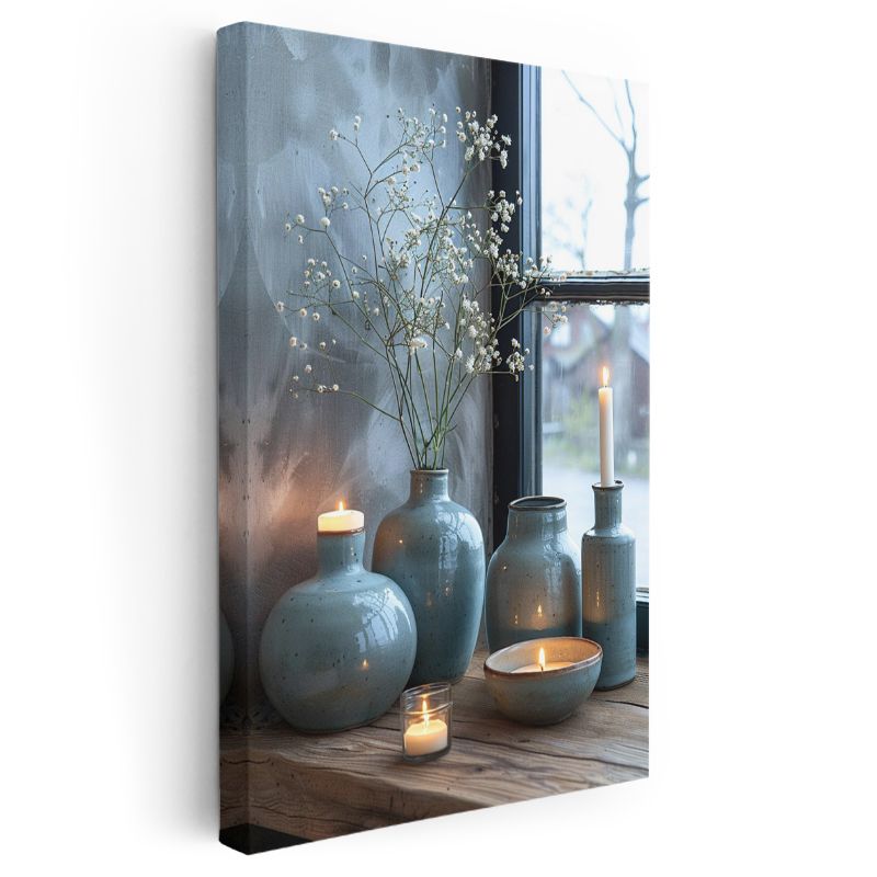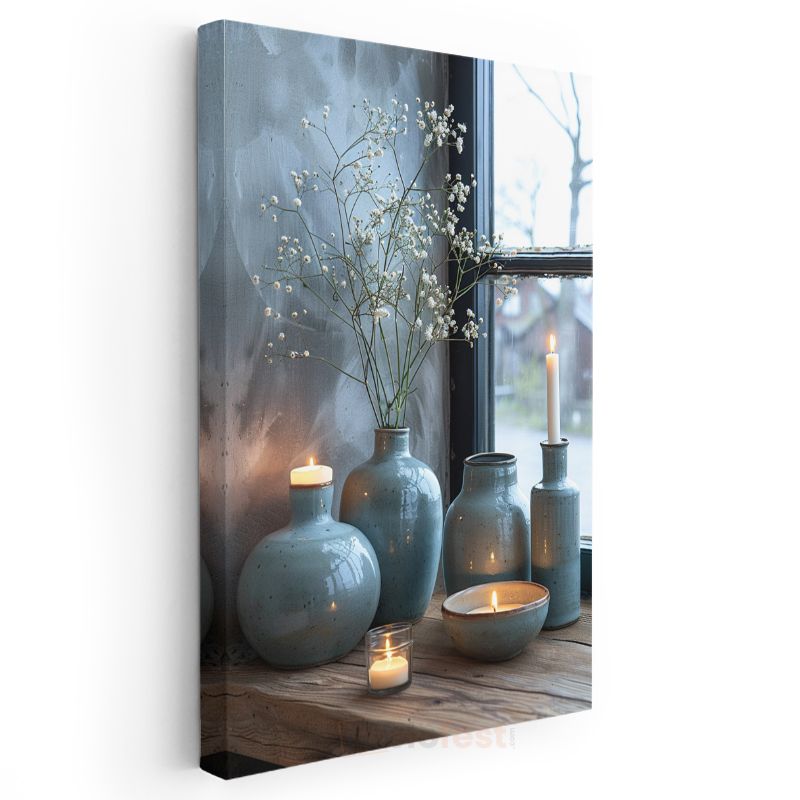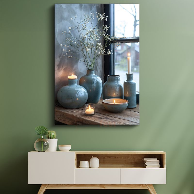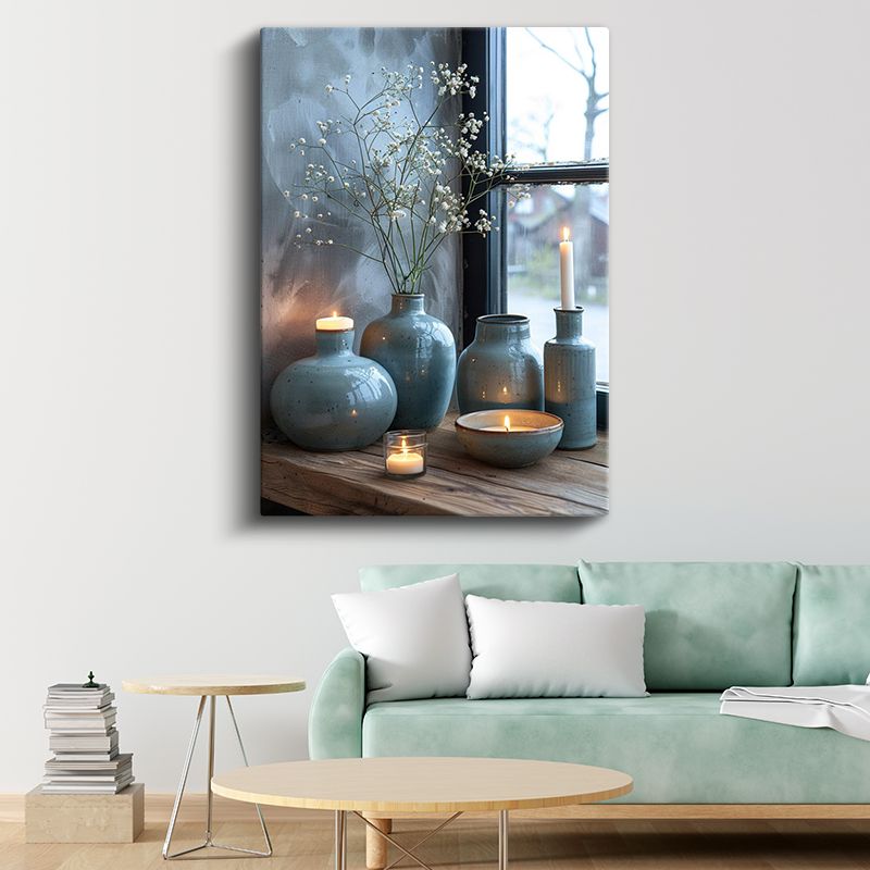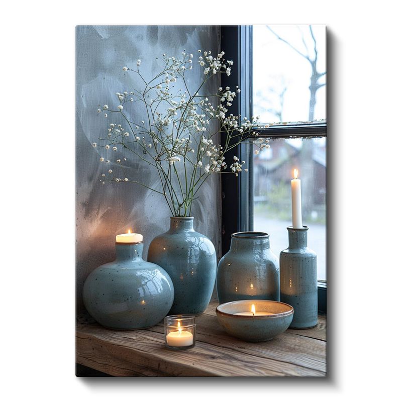 Mavi Vazolar - Pencere Kenarı Dekorasyonu Kanvas Tablo
