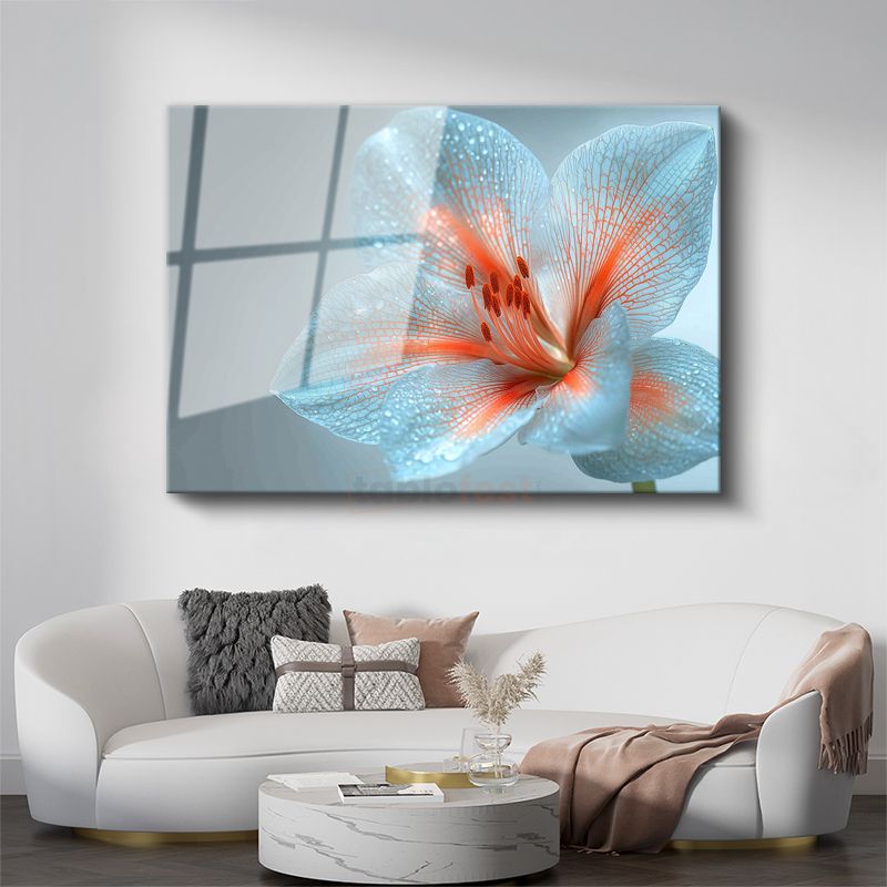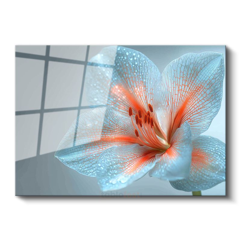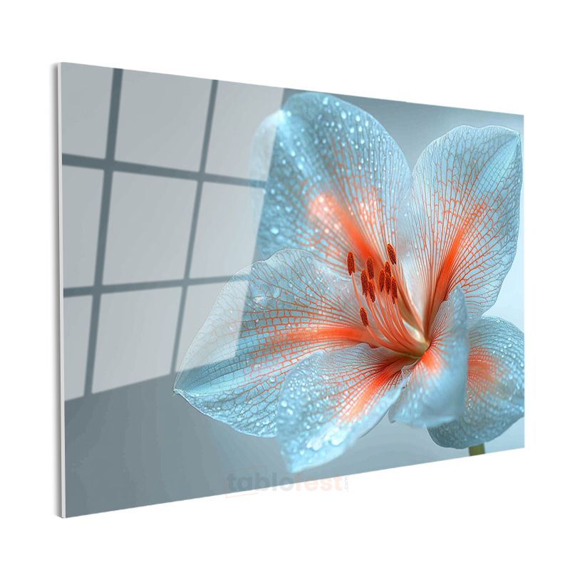 Mavi Zambak - Çiy Damlacıklı Zarif Çiçek Portresi Cam Tablo