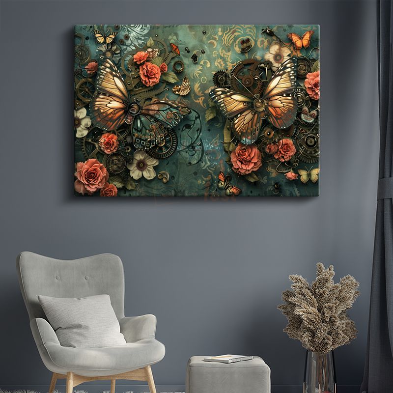 Mekanik Kelebekler - Çarklar ve Çiçekler Arasında Dans Kanvas Tablo