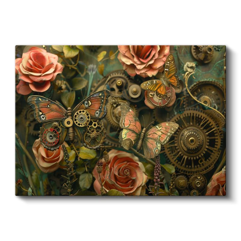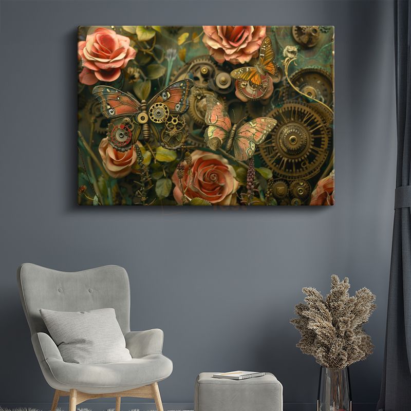 Mekanik Metamorfoz - Çarklar ve Dişlilerden Oluşan Kelebek Bahçesi Kanvas Tablo