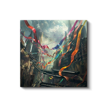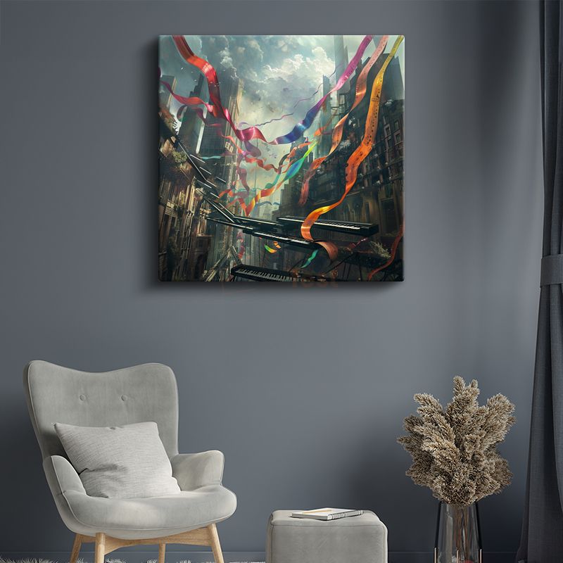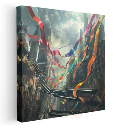 Melodilerin Dansı - Şehir Üzerinde Süzülen Notalar Kanvas Tablo
