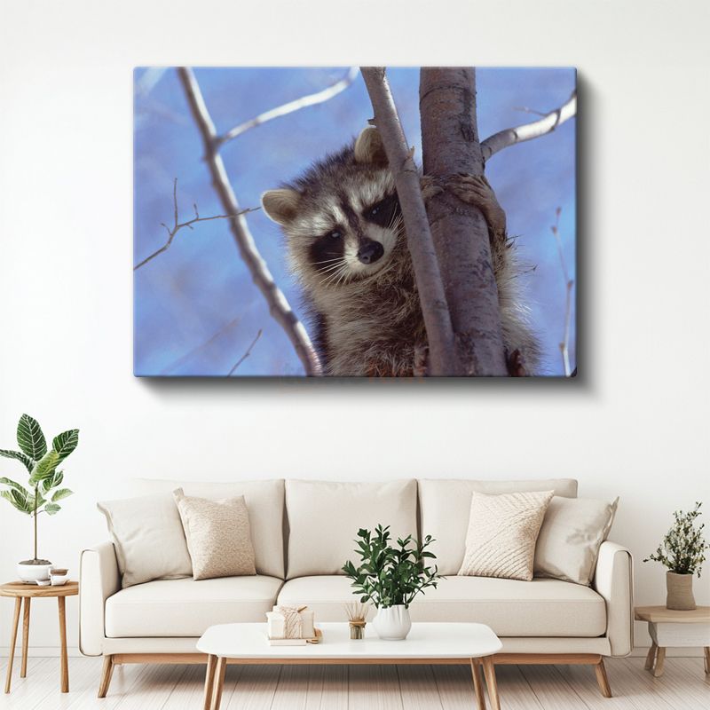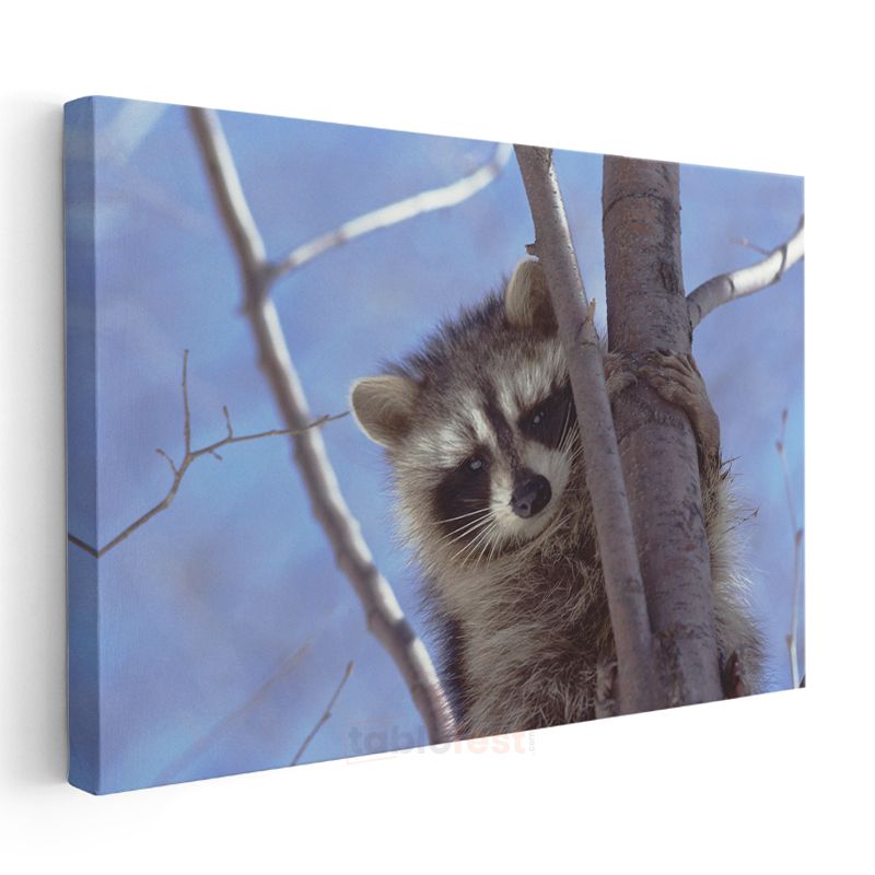 Meraklı Rakun - Ağaç Dalında Bekleyen Maskeli Yüzlü Kanvas Tablo