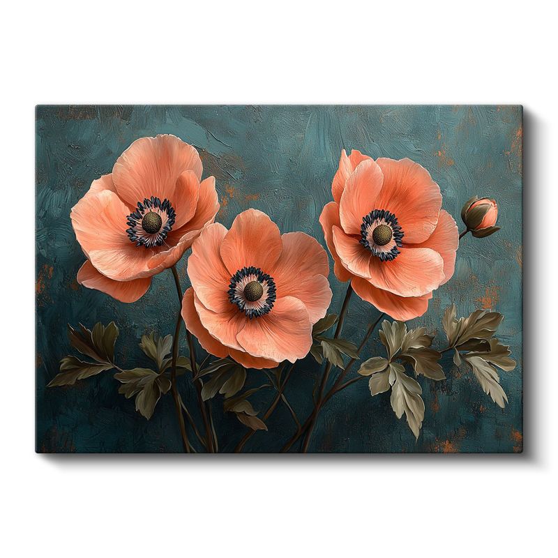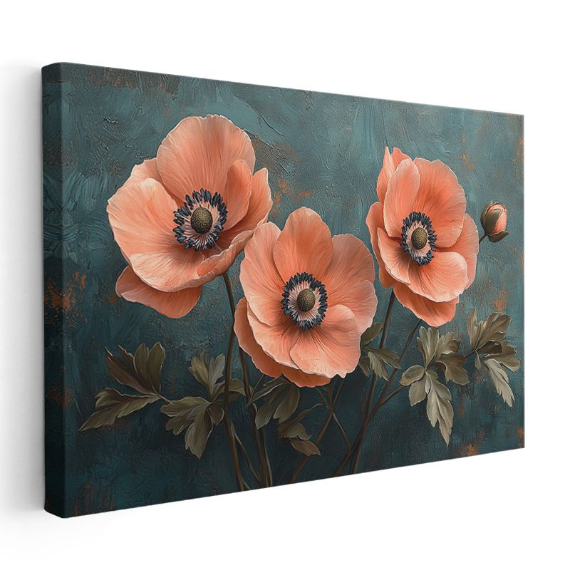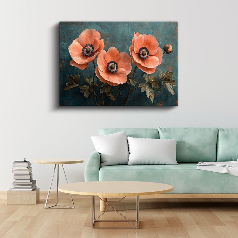 Mercan Gelincikler - Turkuaz Fonda Üçlü Çiçek Kompozisyonu Kanvas Tablo