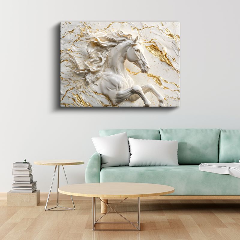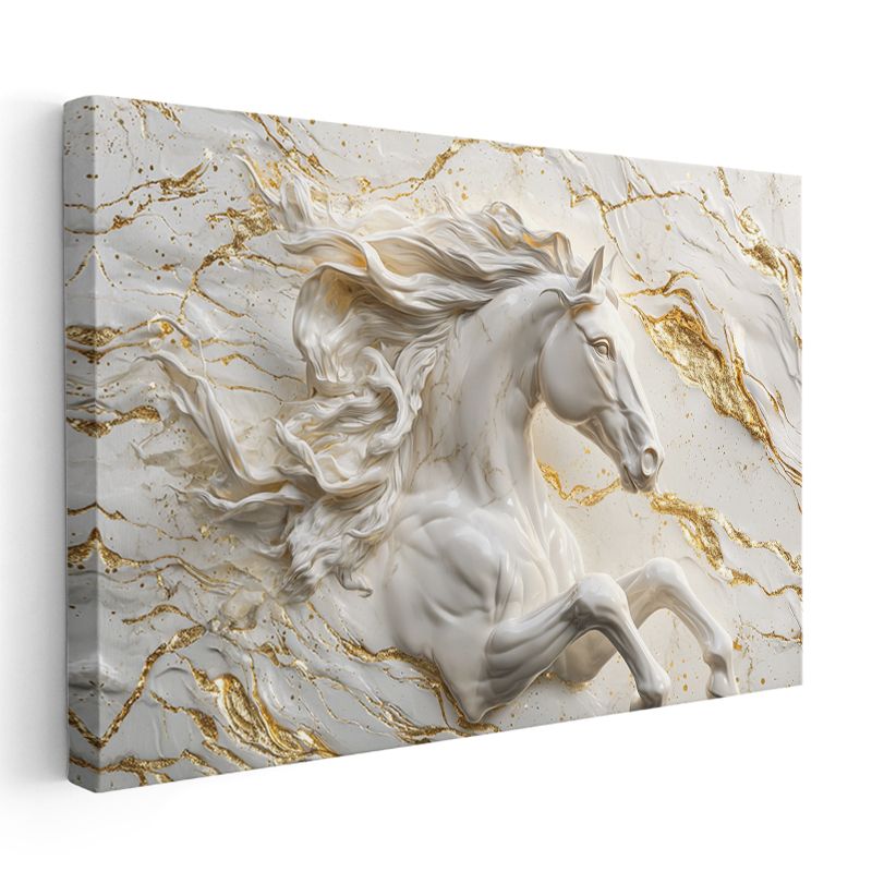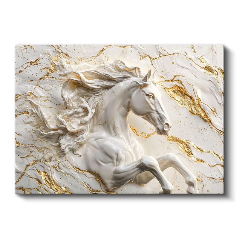 Mermer At - Altın Detaylı Beyaz Heykel Kanvas Tablo