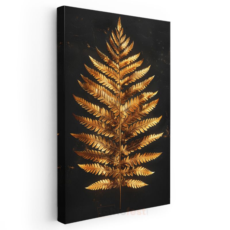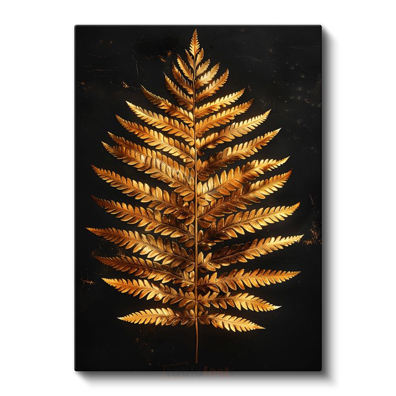 Metalik Eğrelti - Siyah Zeminde Altın Yaprak Kanvas Tablo