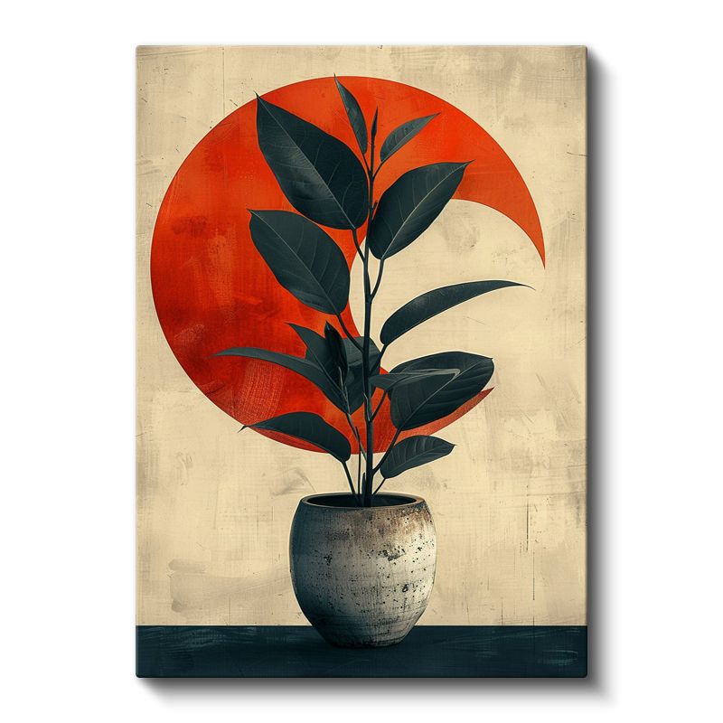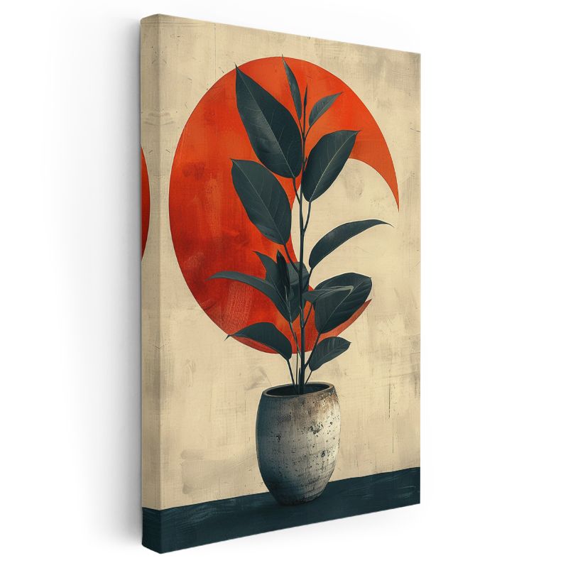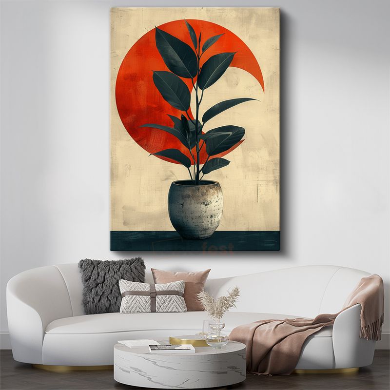 Minimalist Bitki - Kırmızı Daire Fonlu Saksılı Yaprak Kanvas Tablo