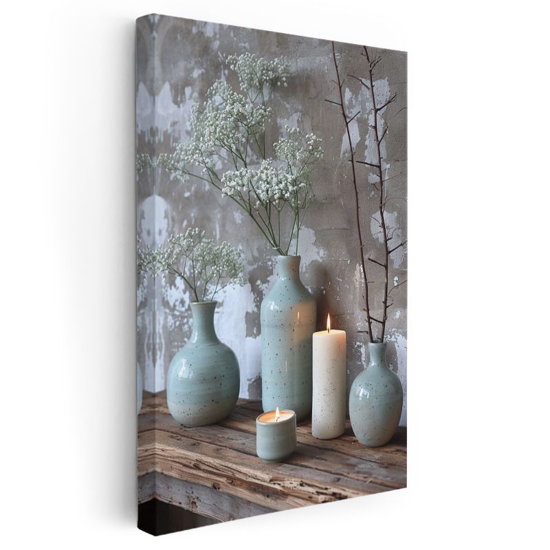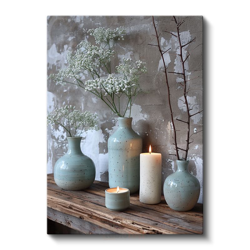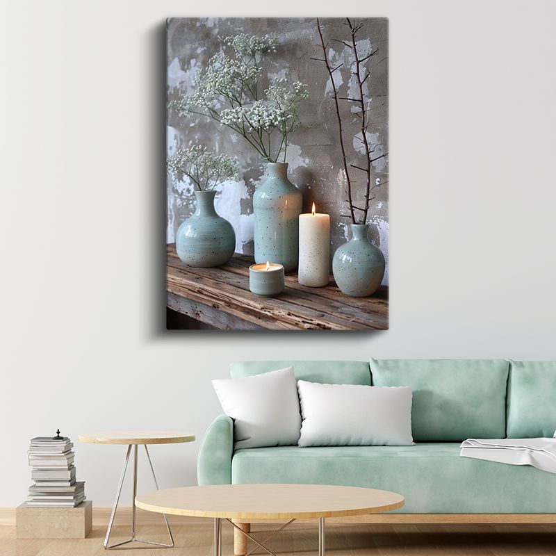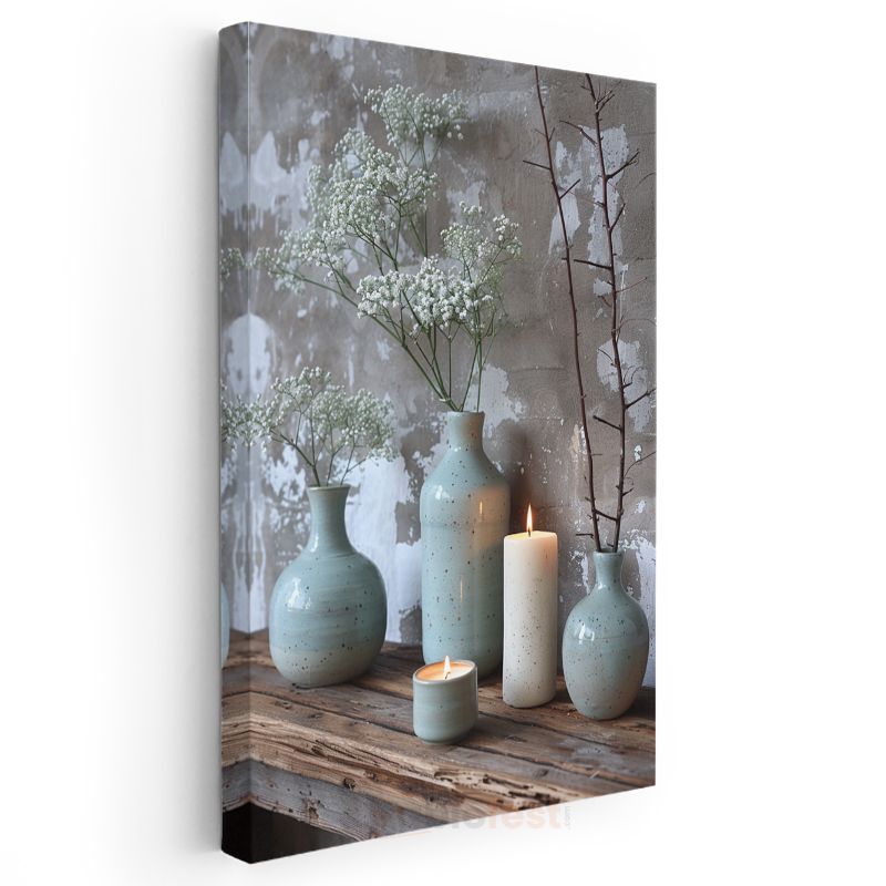 Minimalist Vazolar - Beyaz Çiçekler ve Mumlarla Dekoratif Kanvas Tablo