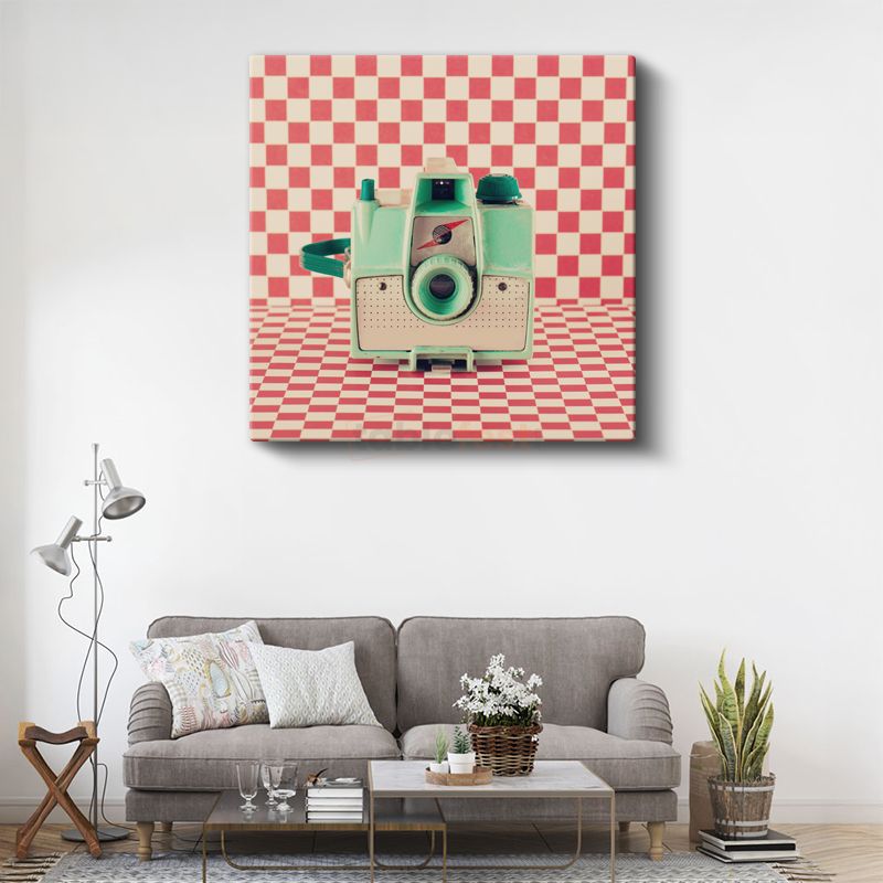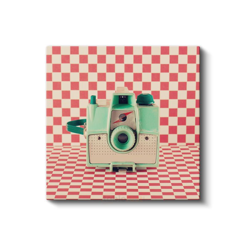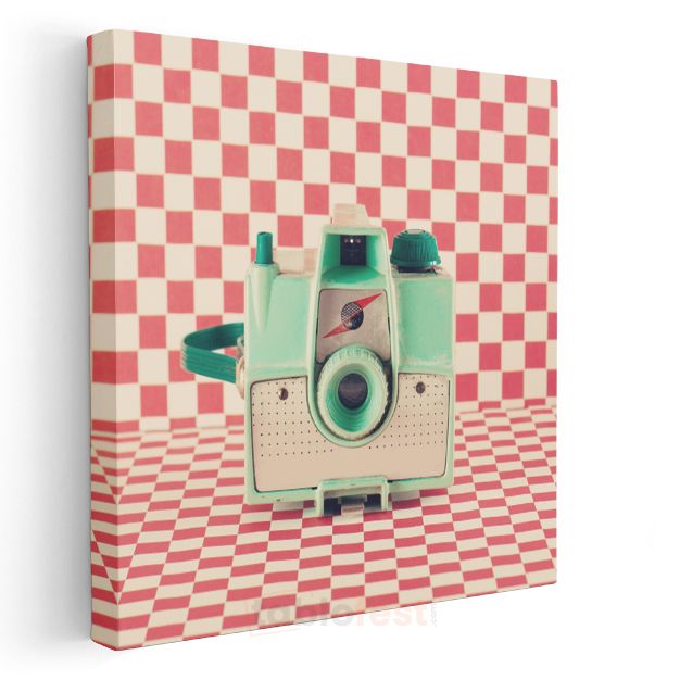 Mint Yeşili Fotoğraf Makinesi - Retro Kareli Fonda Nostaljik Ekipman Kanvas Tablo