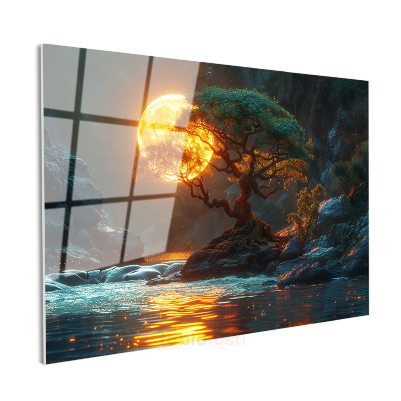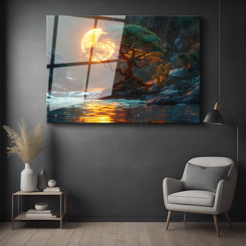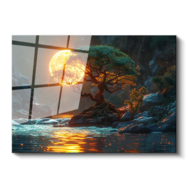 Mistik Ağaç - Dolunay Işığında Parlayan Yalnız Ağaç Cam Tablo