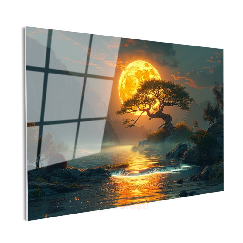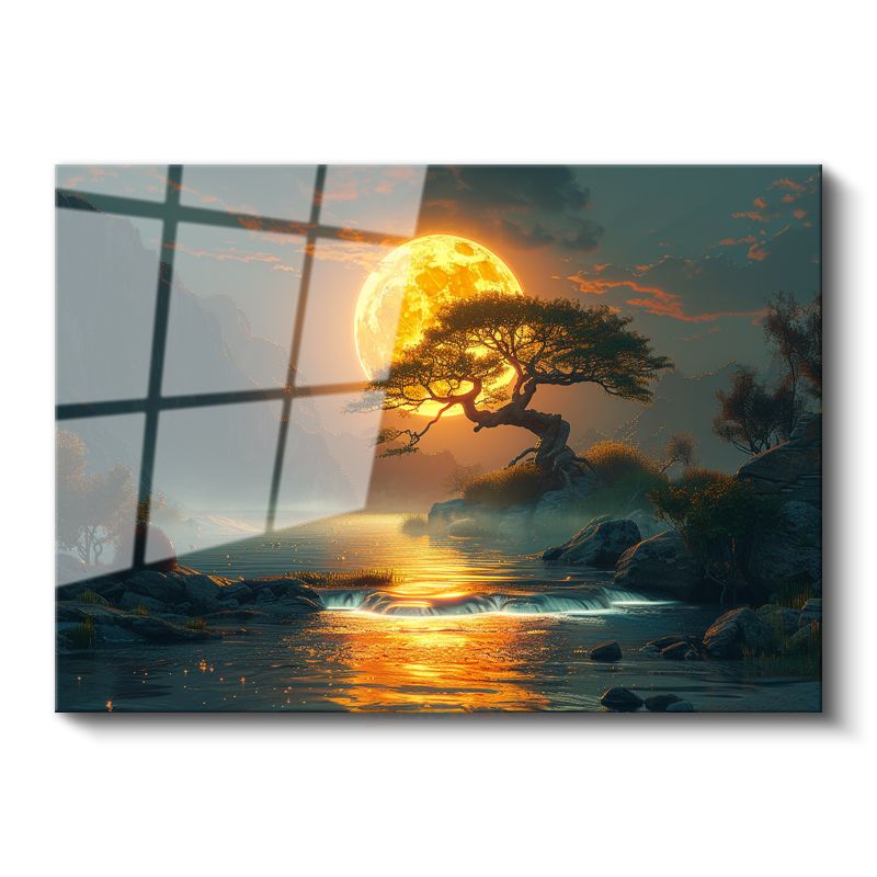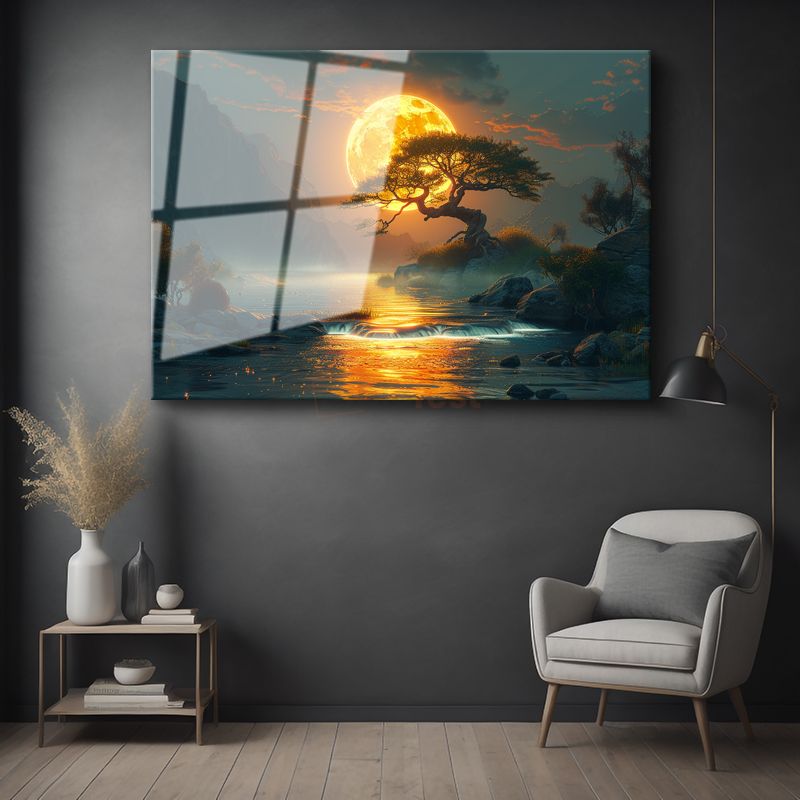 Mistik Dolunay - Altın Işıkta Huzur Veren Göl Manzarası Cam Tablo
