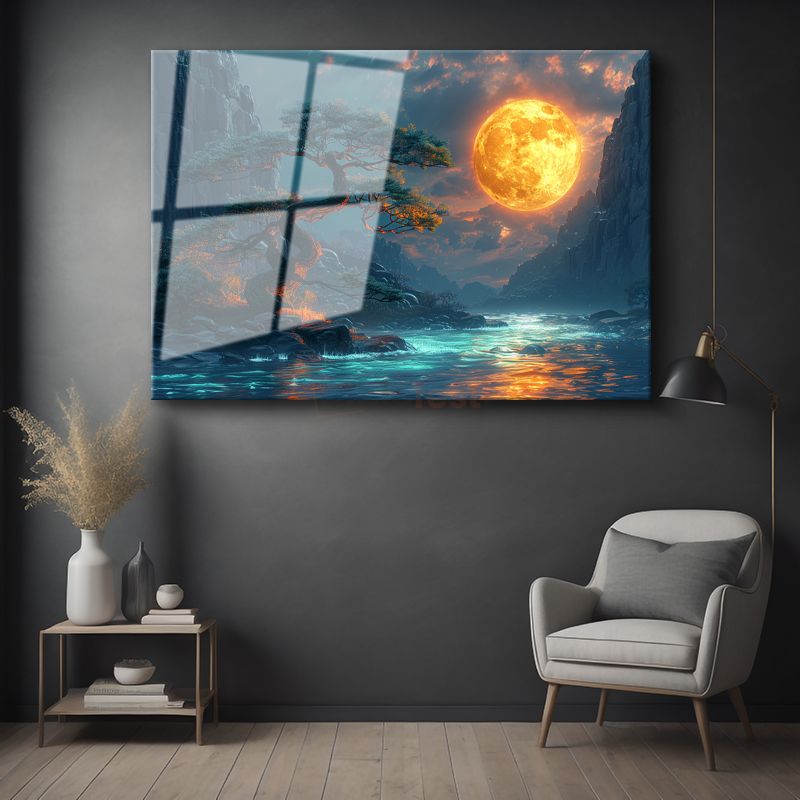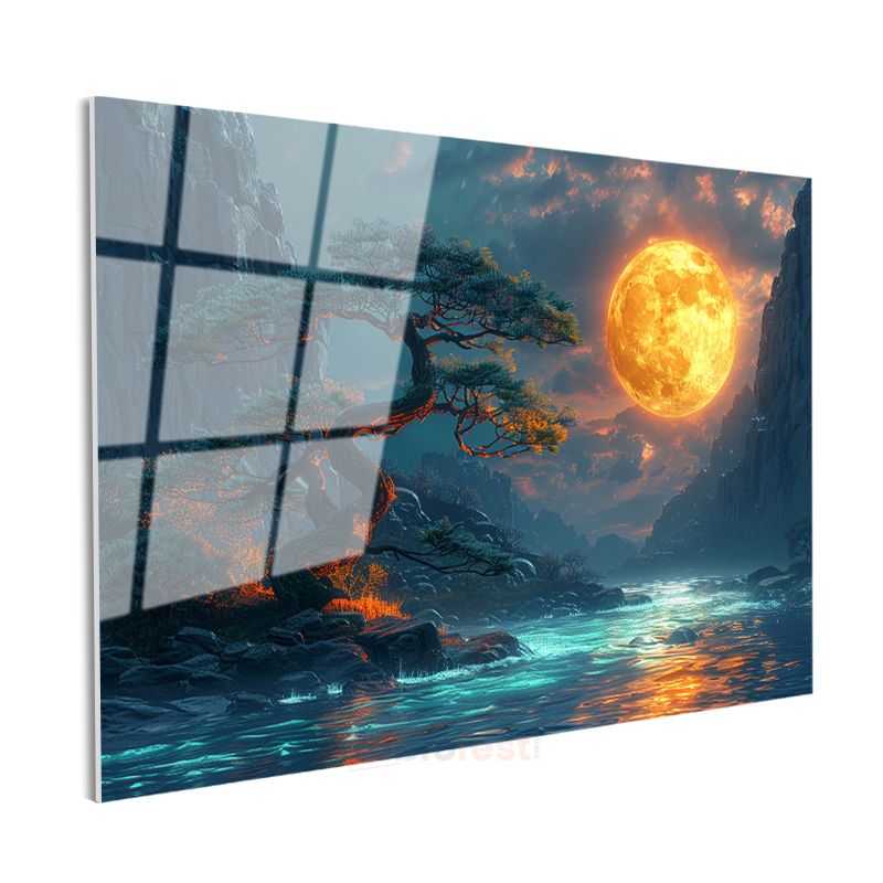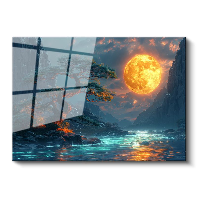 Mistik Dolunay - Kayalıklar Arasında Parlayan Ay Işığı Cam Tablo