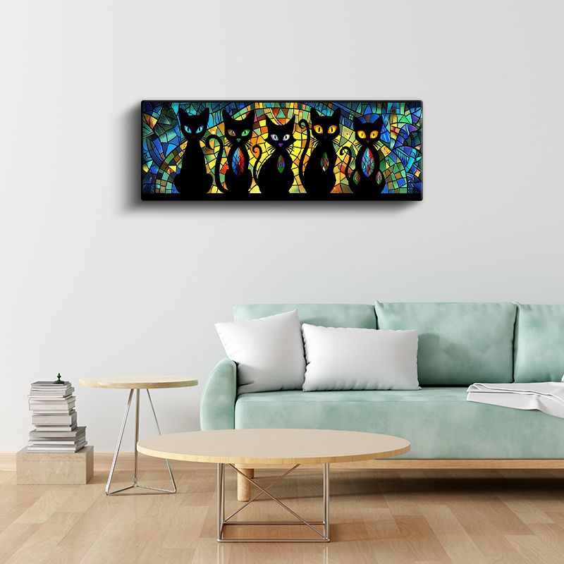 Mistik Kediler - Vitray Desenli Siyah Kedi Siluetleri Kanvas Tablo