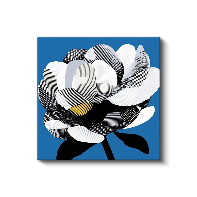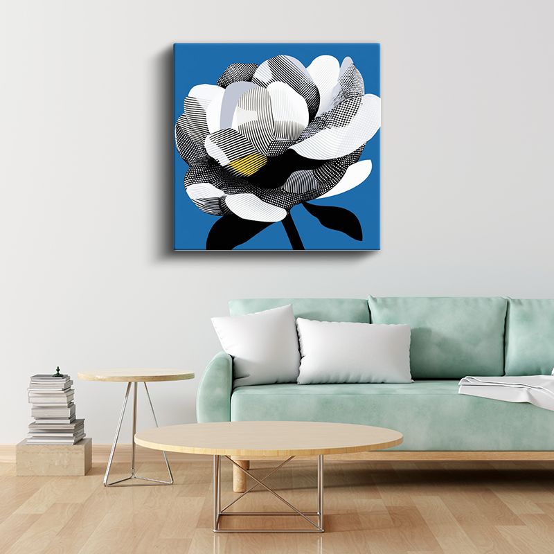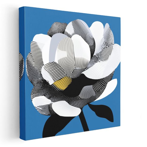 Modern Kamelya - Mavi Fonda Siyah Beyaz Çizgili Çiçek Kanvas Tablo