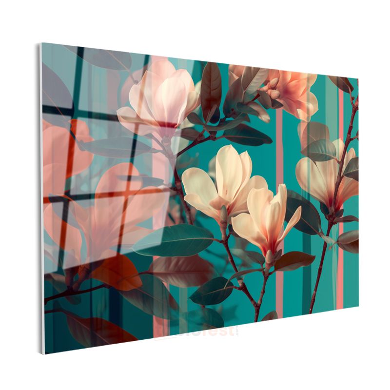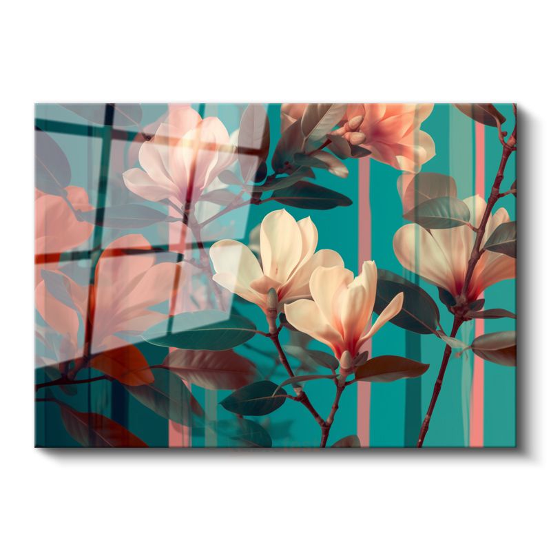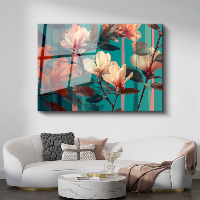 Modern Manolyalar - Turkuaz Fonda Çiçek Harmonisi Cam Tablo