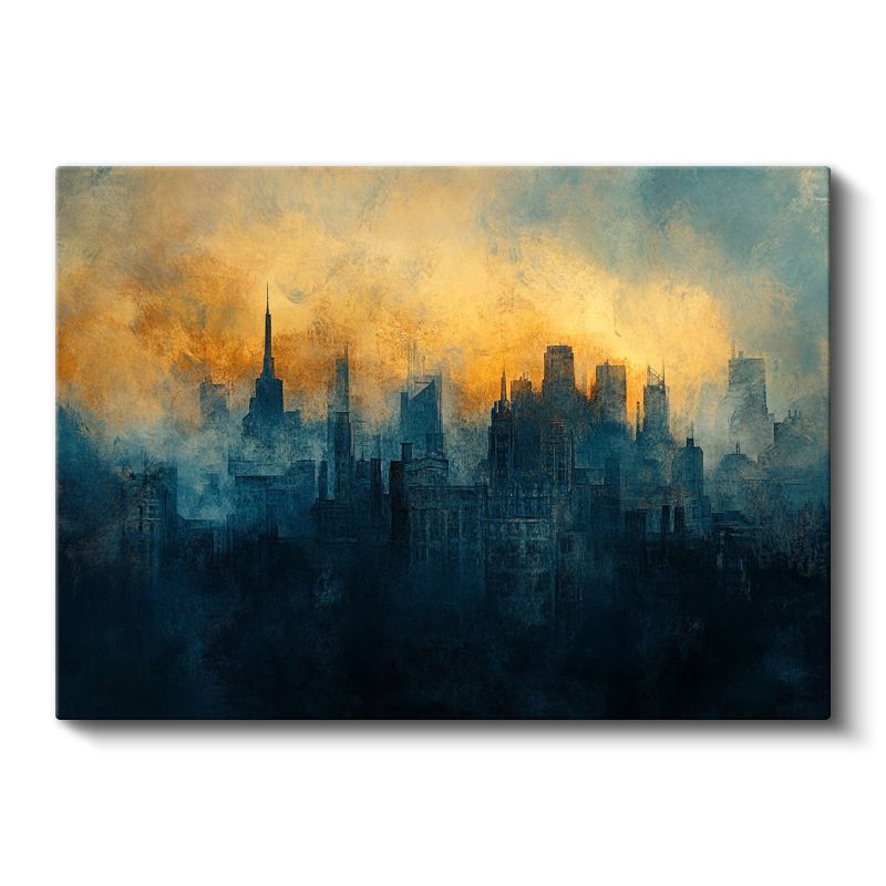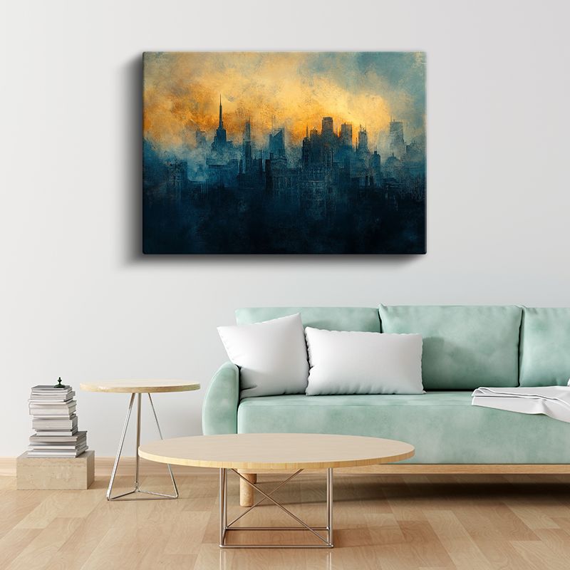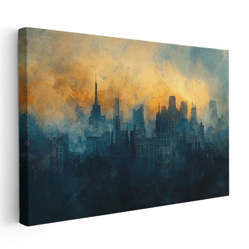 Modern Şehir Silueti - Altın Gökyüzü Altında Gökdelenler Kanvas Tablo
