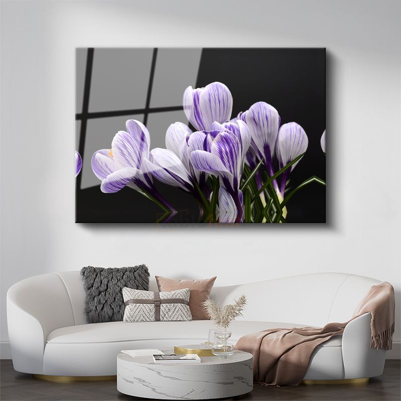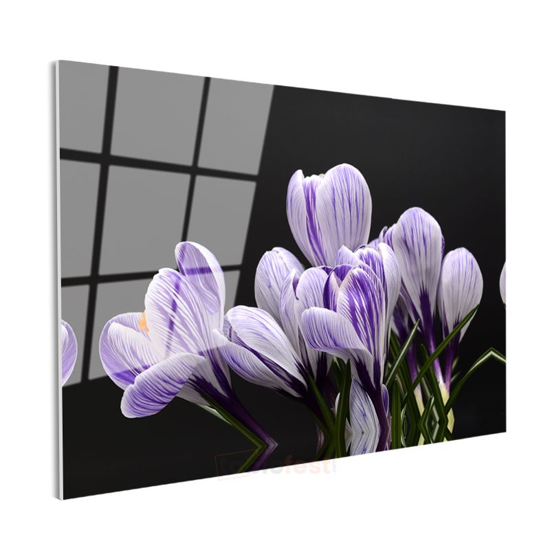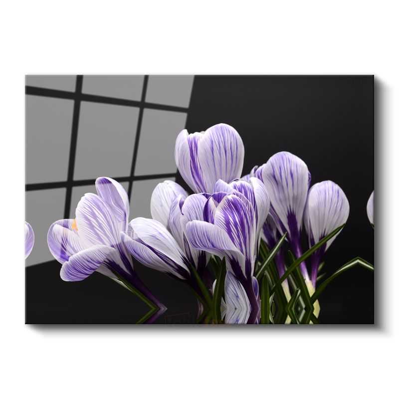 Mor Çiğdem - Siyah Fonlu Çizgili Çiçekler Cam Tablo