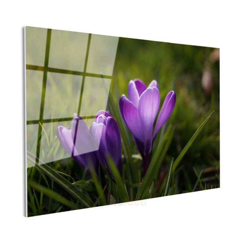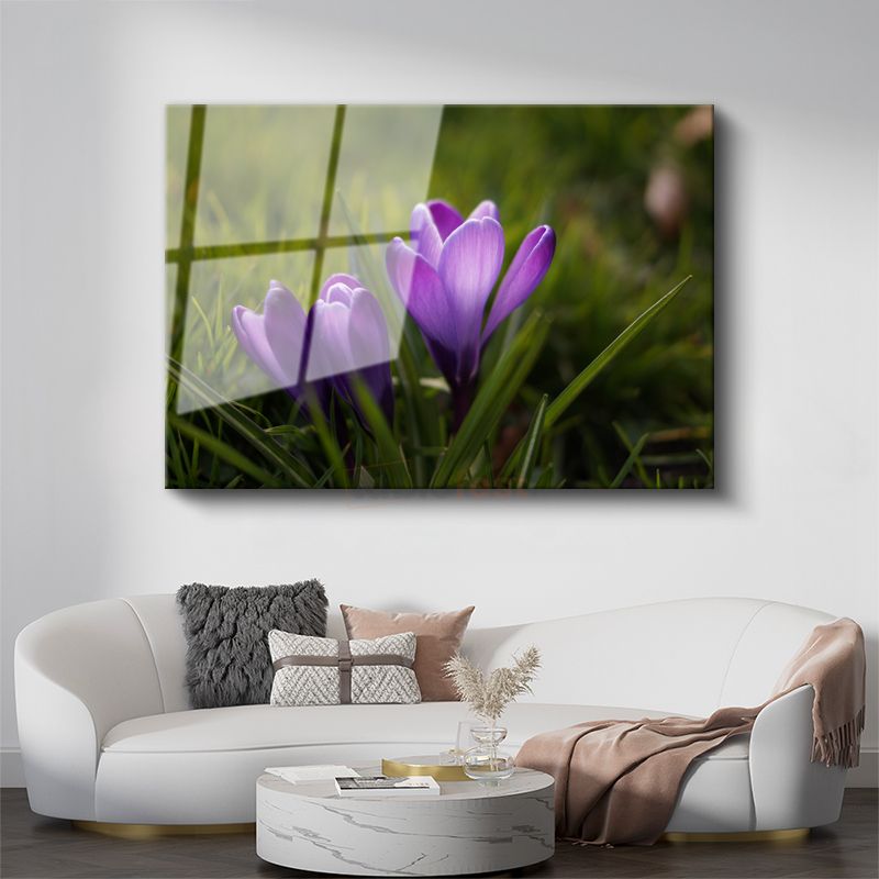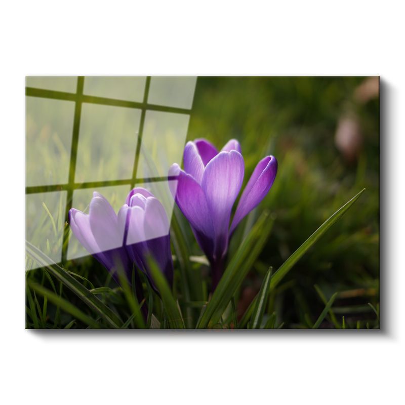 Mor Çiğdemler - Çimen Üzerinde Bahar Cam Tablo