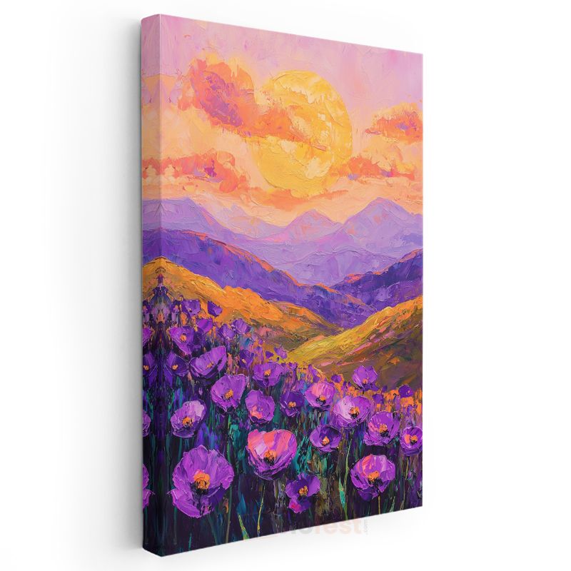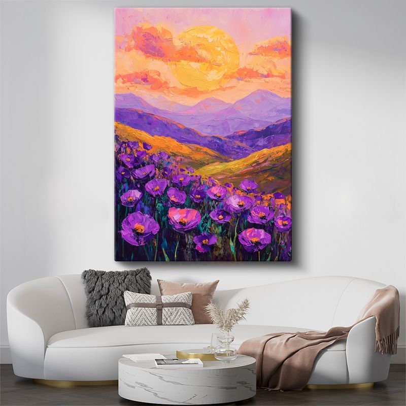 Mor Gelincik Tarlası - Gün Batımı Manzarası Kanvas Tablo