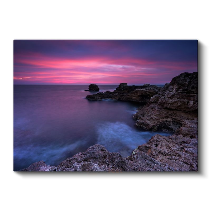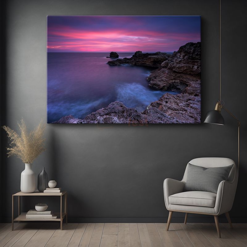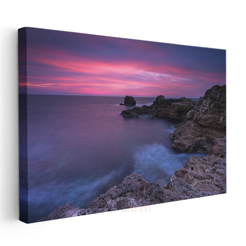Mor Sahil - Alacakaranlıkta Kayalık Kıyı Kanvas Tablo