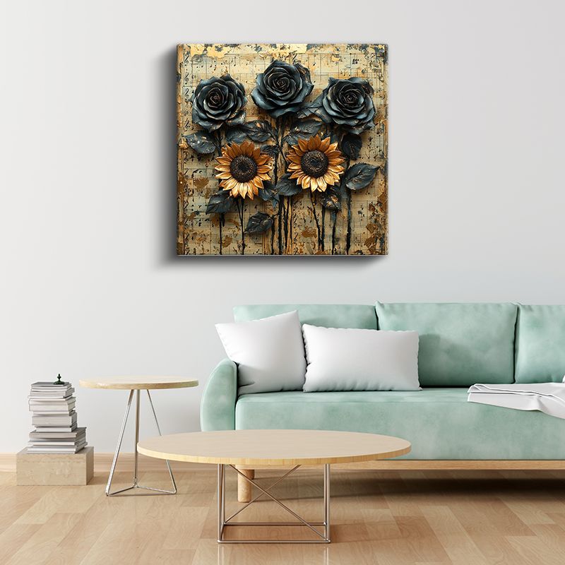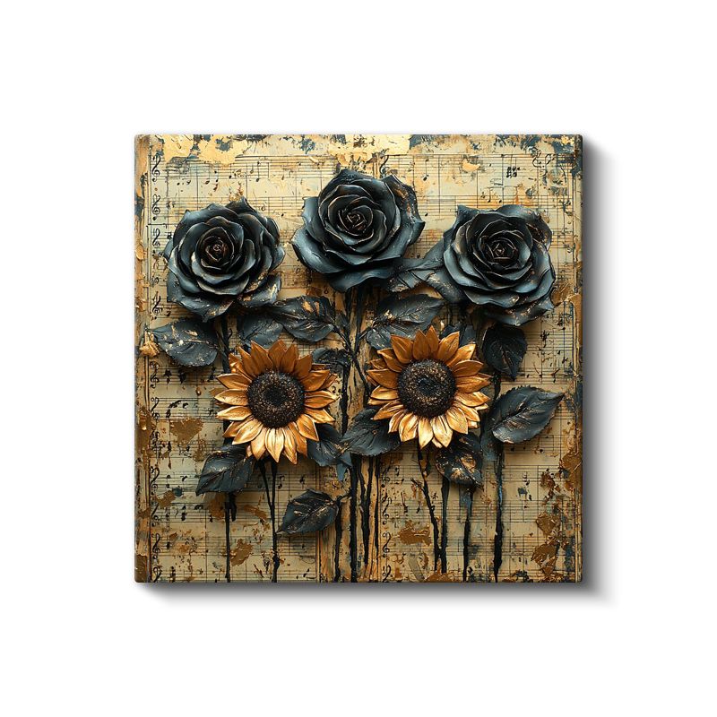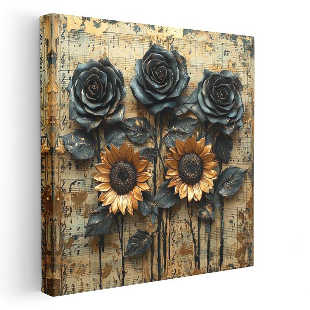 Müzikal Kompozisyon - Nota Kağıdı Üzerinde Ayçiçeği ve Güller Kanvas Tablo