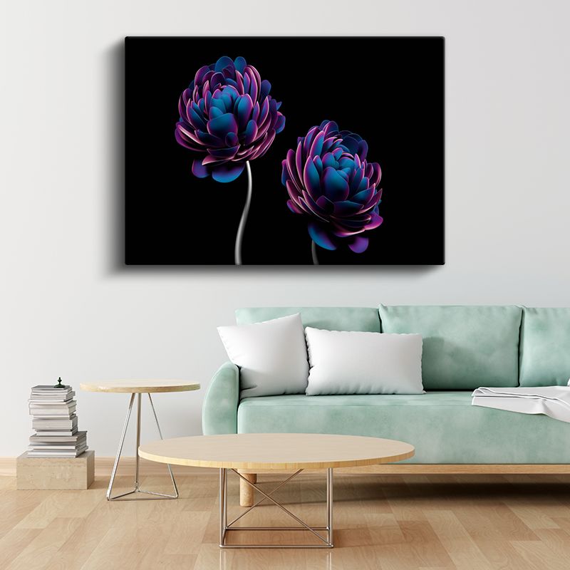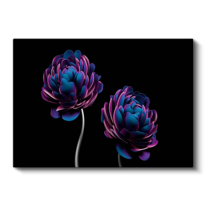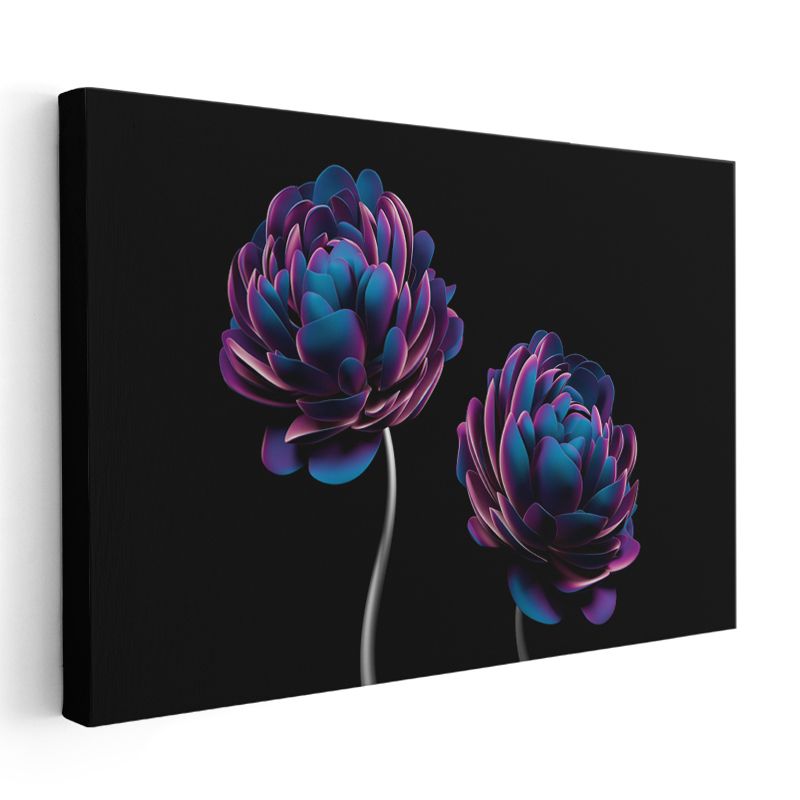 Neon Çiçekler - Siyah Zeminde Mor Mavi Vektörel Çiçek Formları Kanvas Tablo