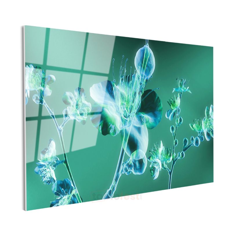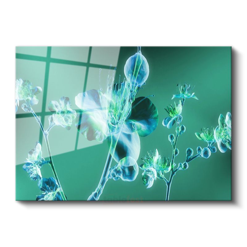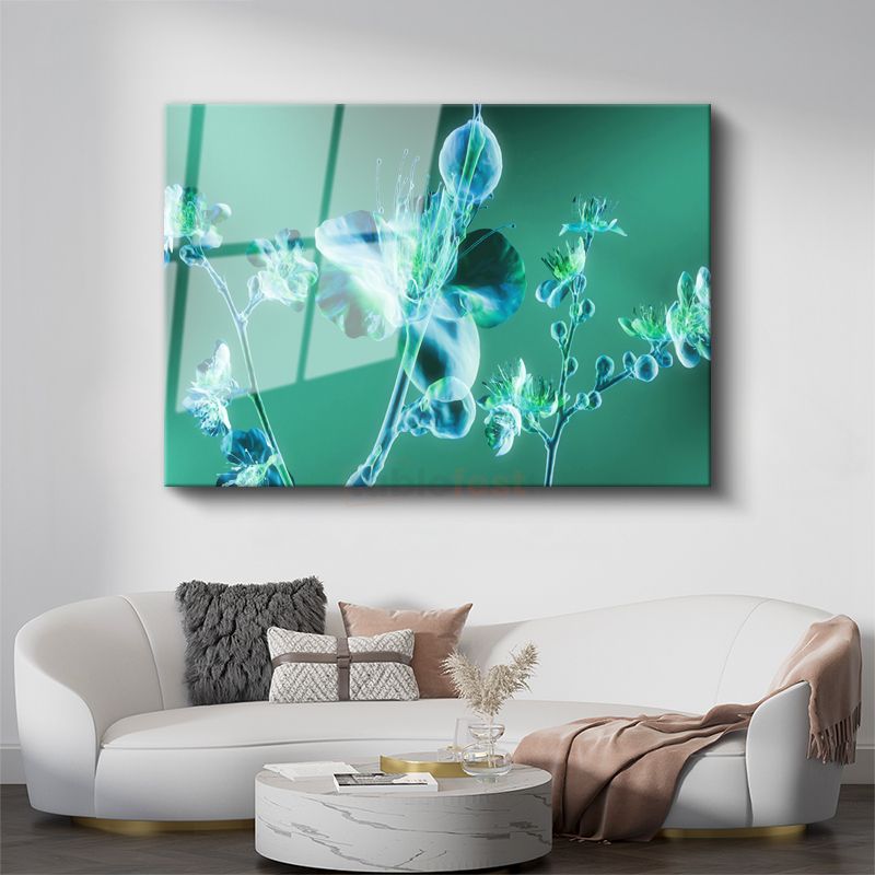 Neon Çiçekler - Yeşil Fonda Işıklı Bitki Silueti Cam Tablo