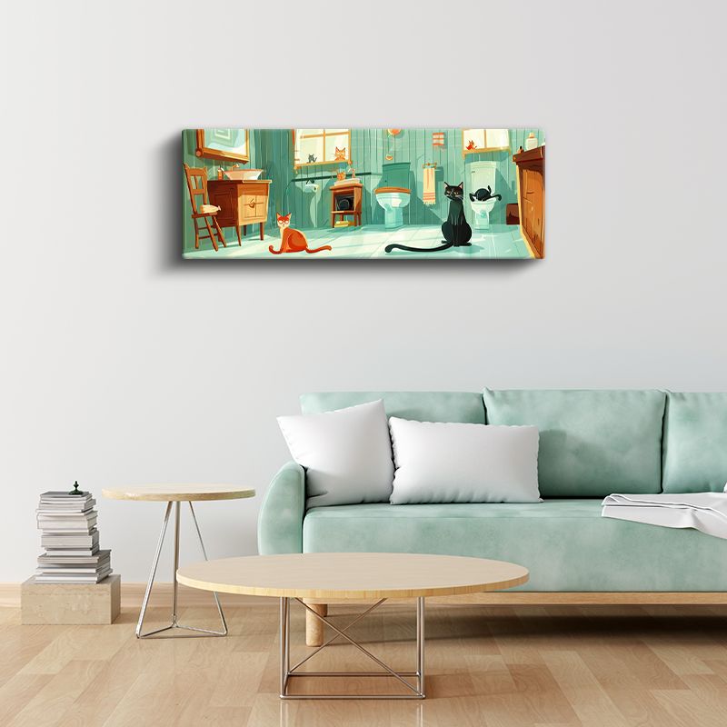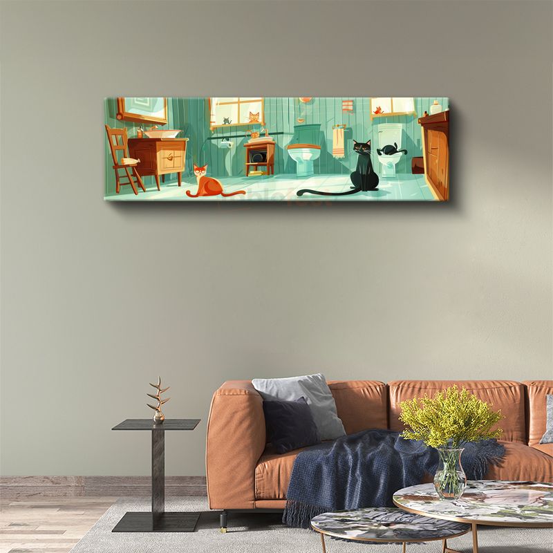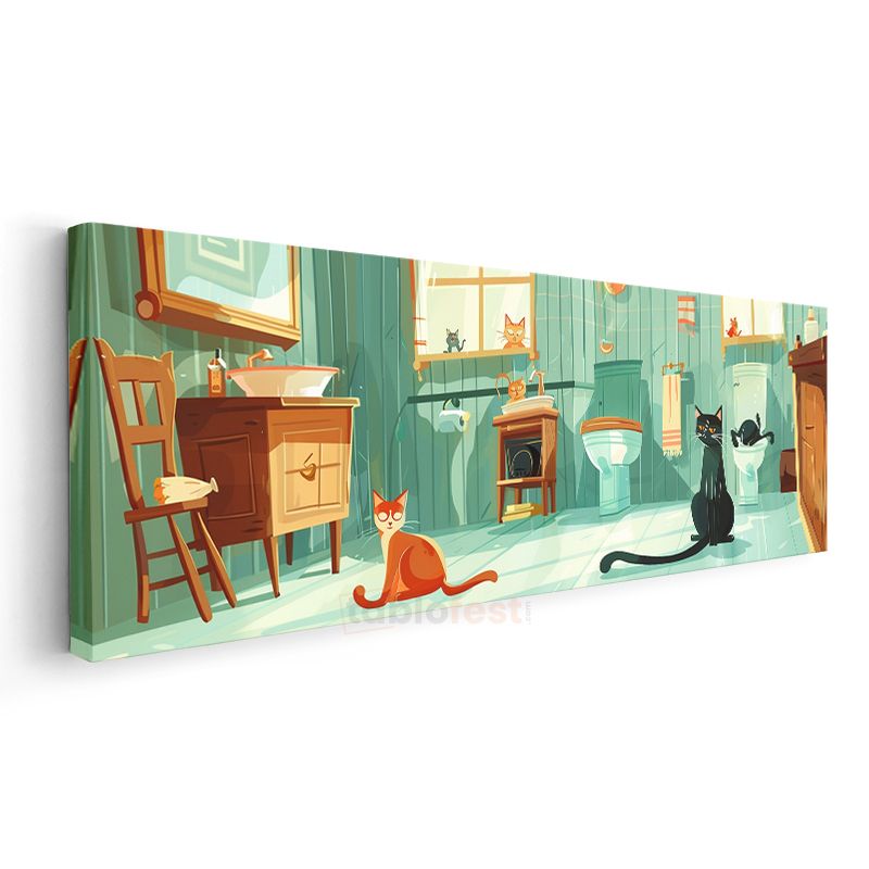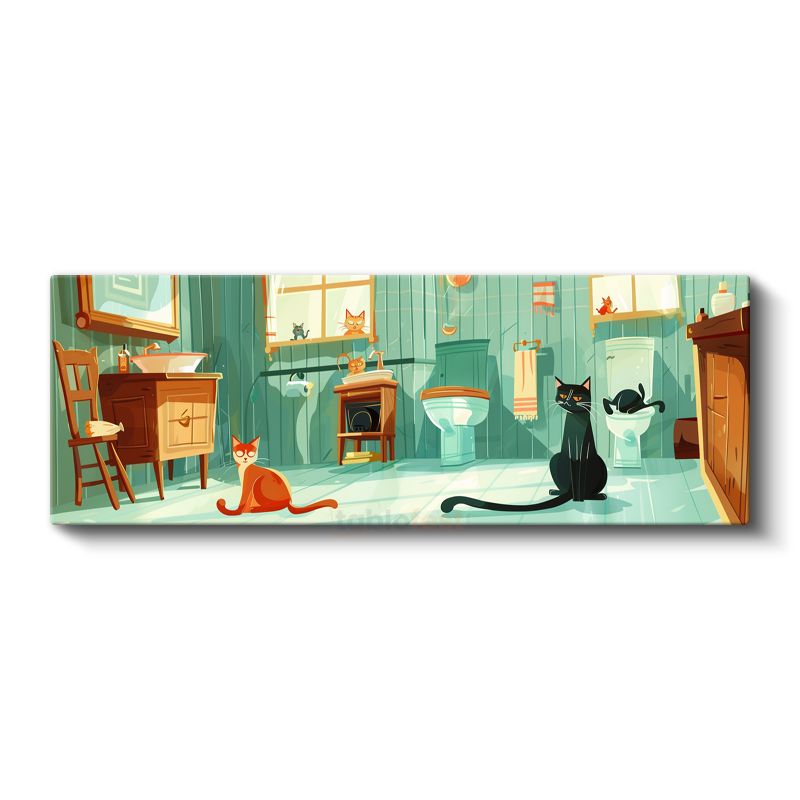 Neşeli Kediler - Vektörel Çizgi Film Tarzı Banyo Sahnesi Kanvas Tablo