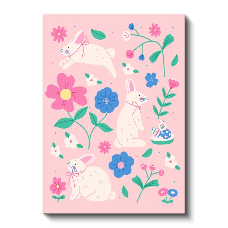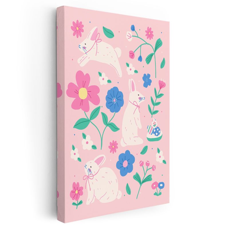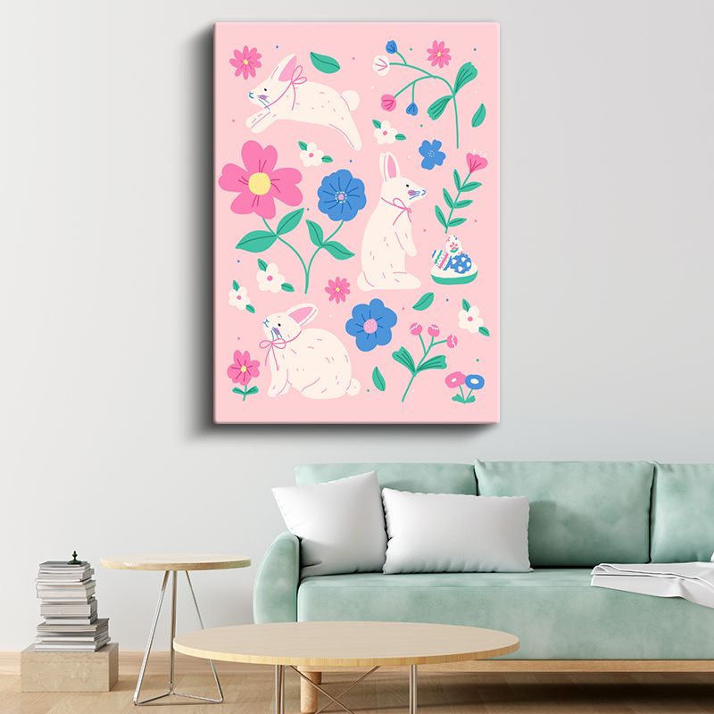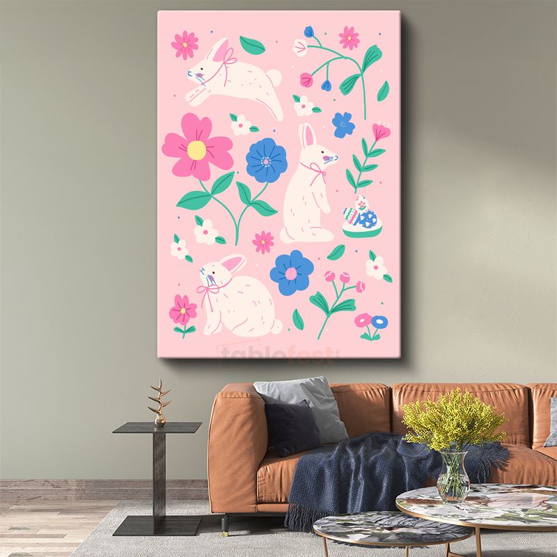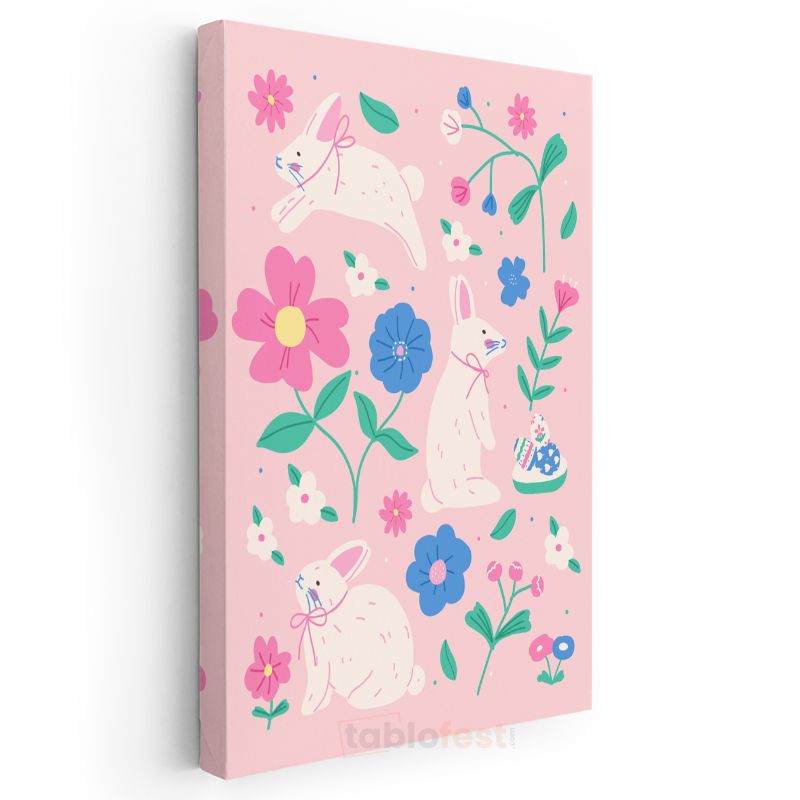 Neşeli Tavşanlar - Pembe Çiçekli Bahçe İllüstrasyon Kanvas Tablo
