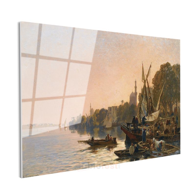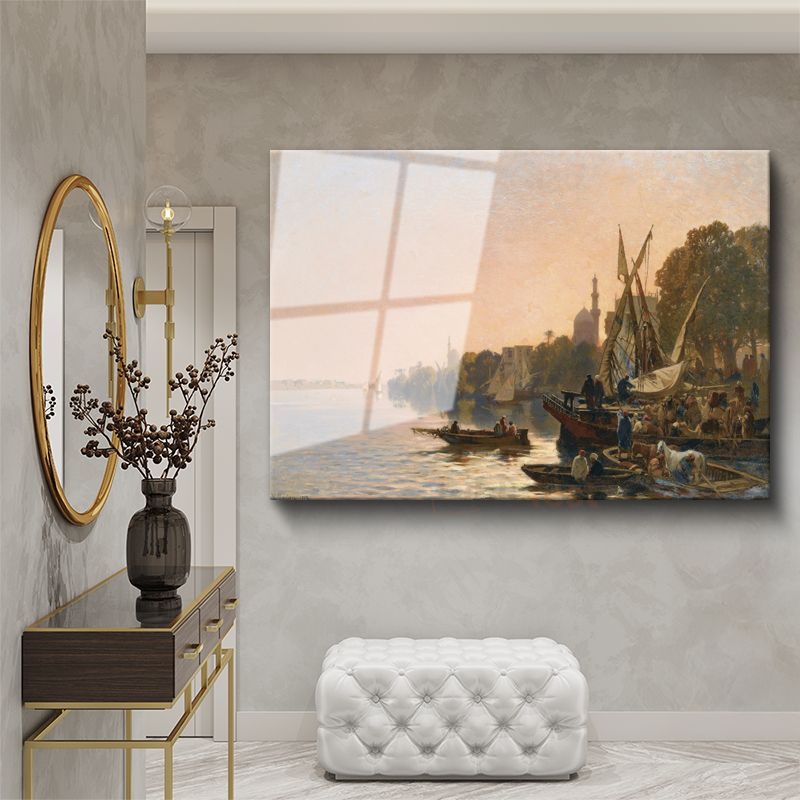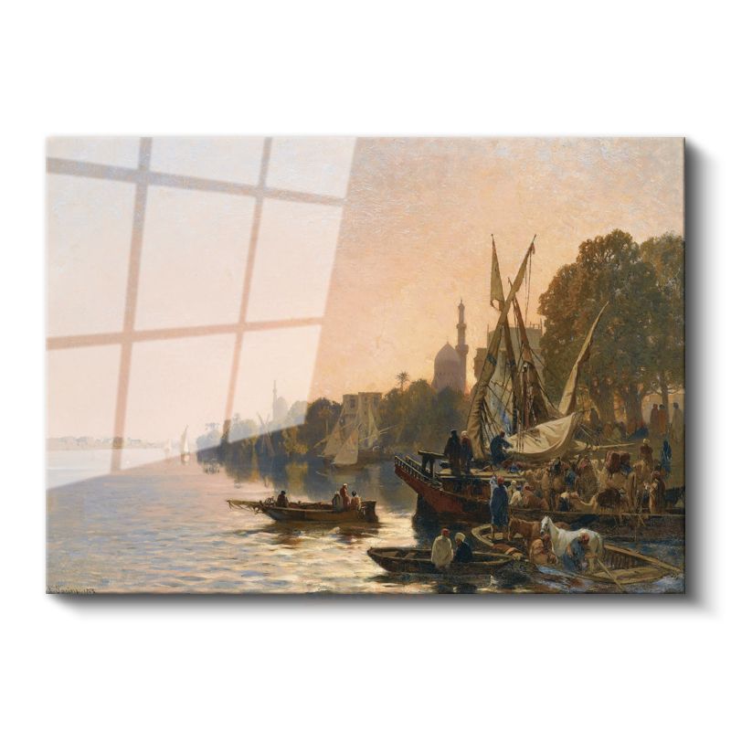 Nil Kıyısı - Gün Batımında Tekneler ve Manzara Cam Tablo