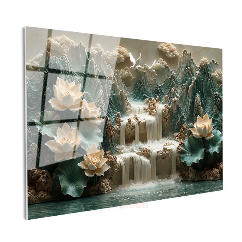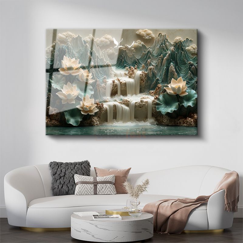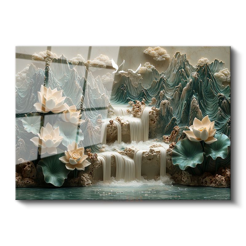 Nilüfer Cenneti - Şelale Manzaralı Lotus Çiçekleri Cam Tablo