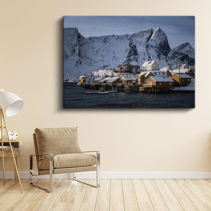 Norveç Evleri - Karlı Dağlar Eteklerinde Balıkçı Köyü Kanvas Tablo