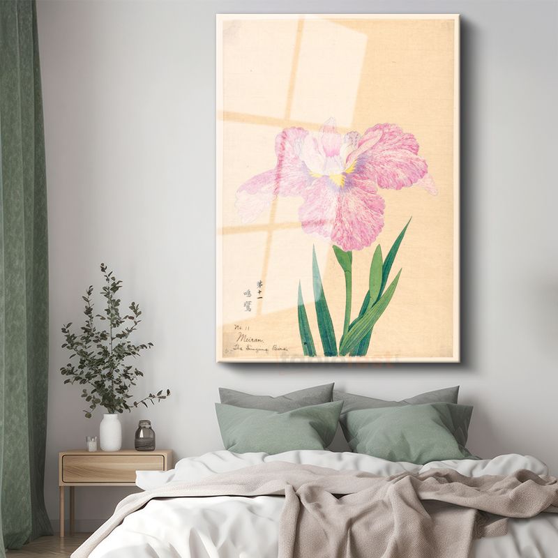 Ohara Koson - Pembe İris Çiçeği Japon Tarzı İllüstrasyon Cam Tablo