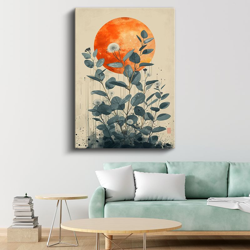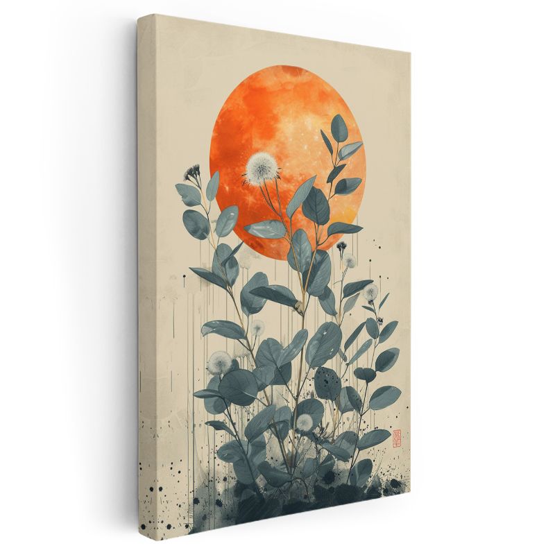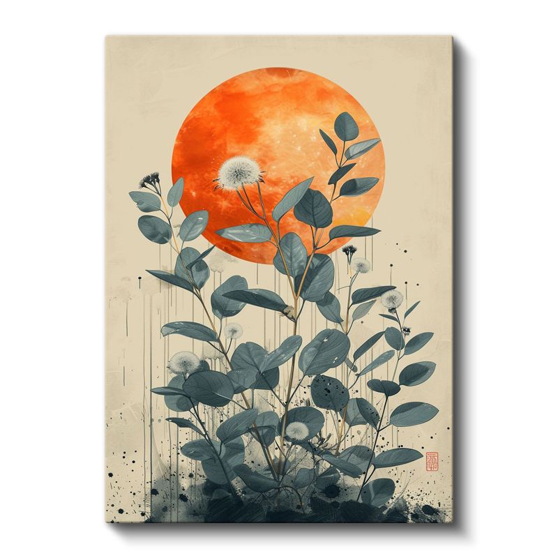 Okaliptus Dalları - Turuncu Güneş Fonlu Modern Botanik Kanvas Tablo
