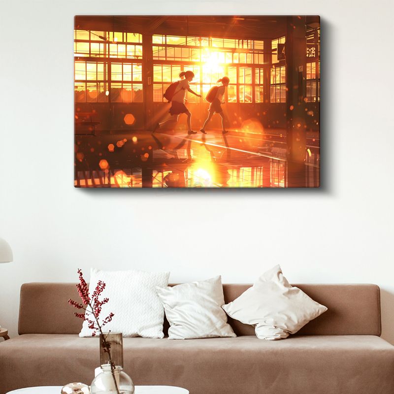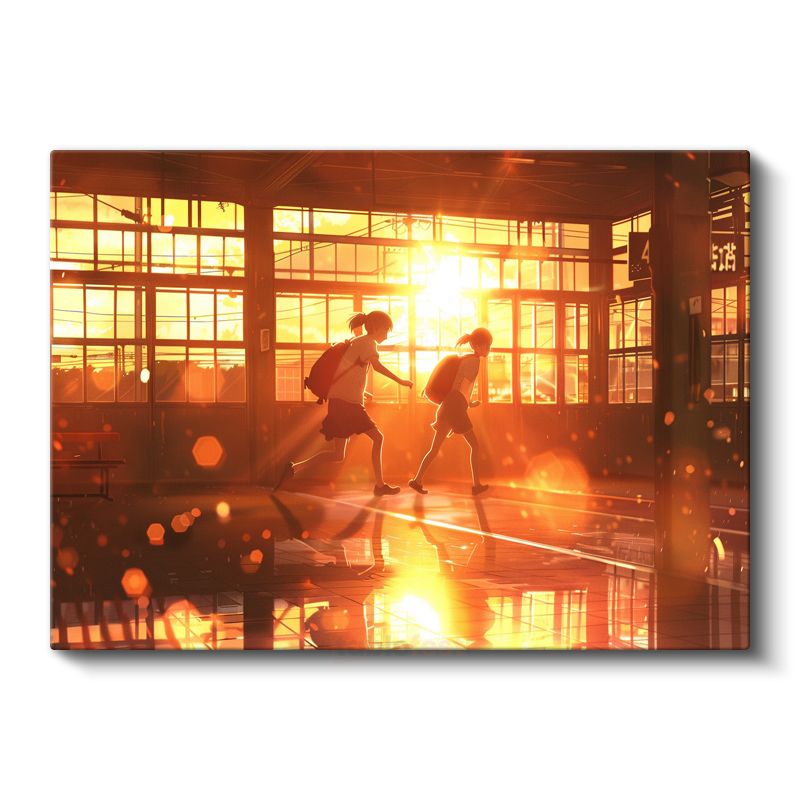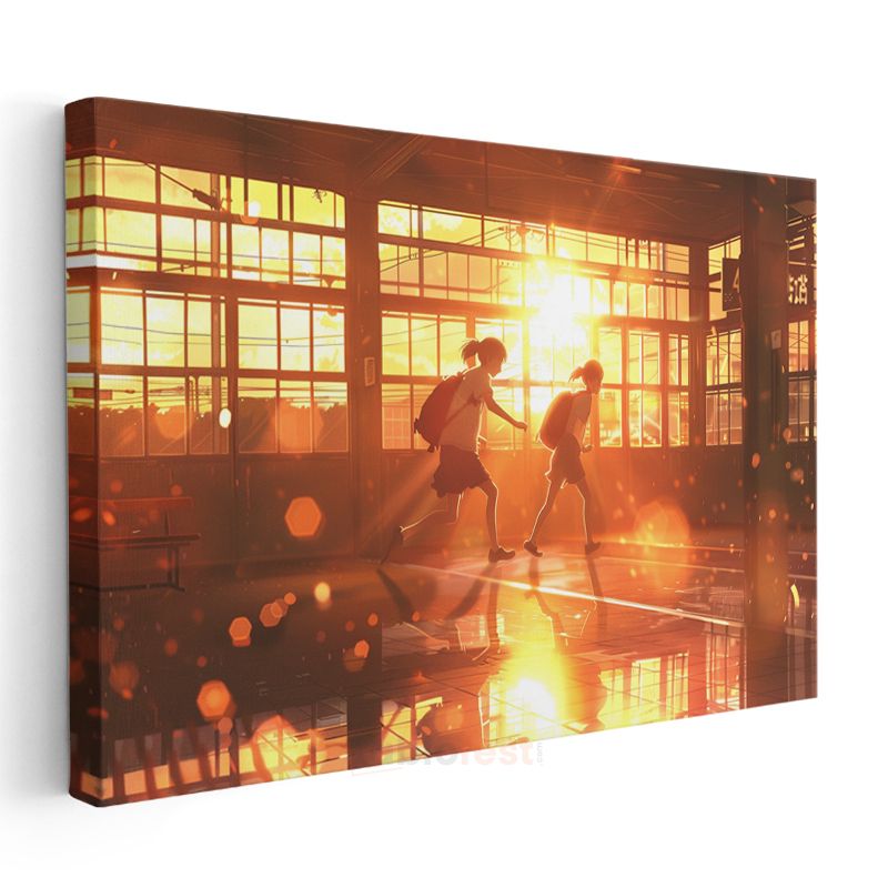 Okul Koridoru - Altın Günbatımı Anime Kanvas Tablo
