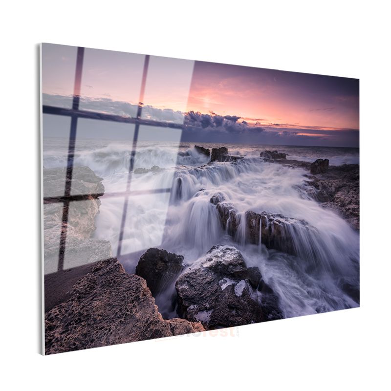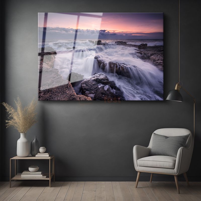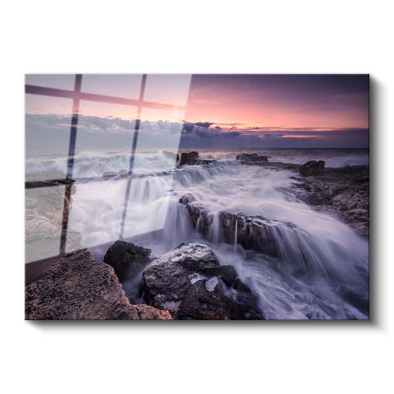 Okyanus Dalgaları - Alacakaranlıkta Kayalıklara Çarpan Köpüklü Dalgalar Cam Tablo