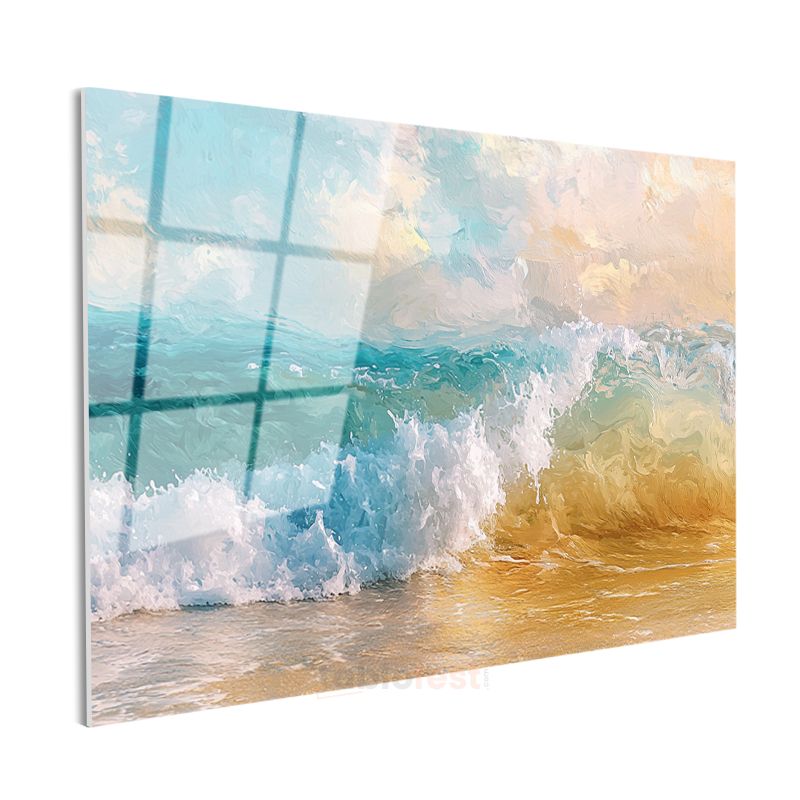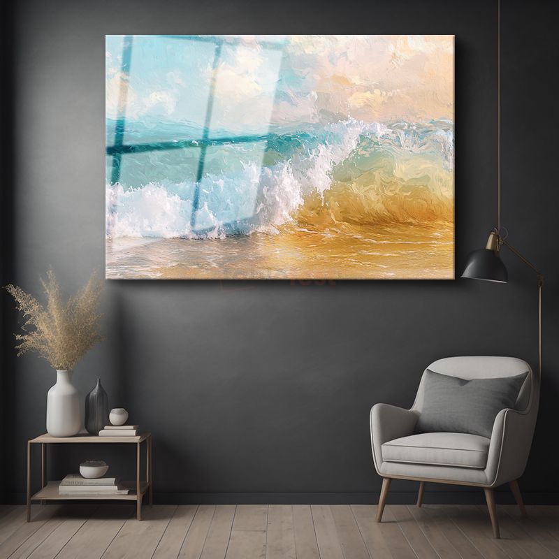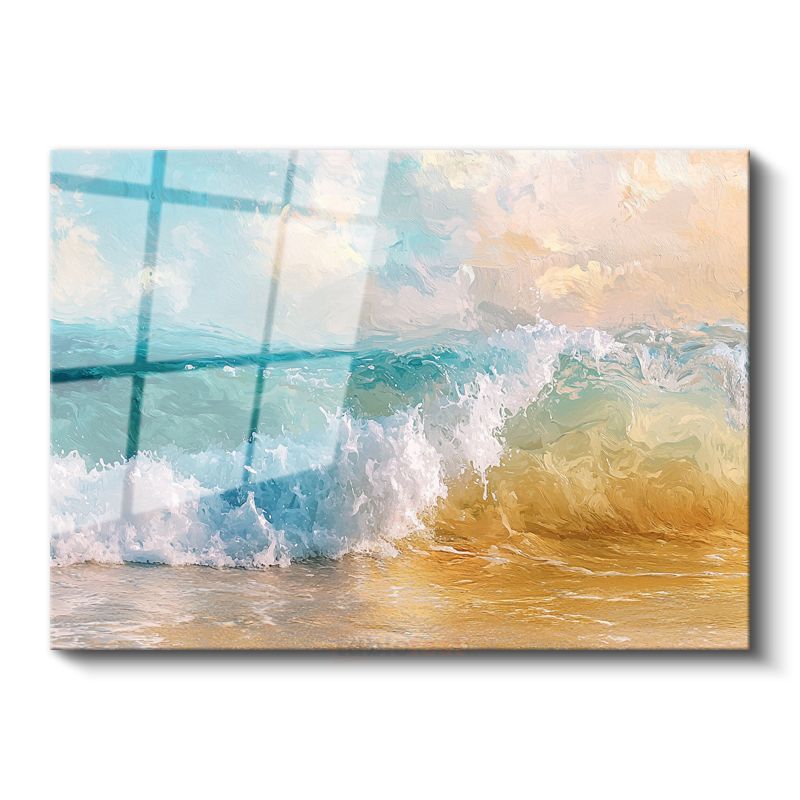Okyanus Dalgası - Turkuaz Sulardan Sahile Vuran Köpüklü Dalga Cam Tablo