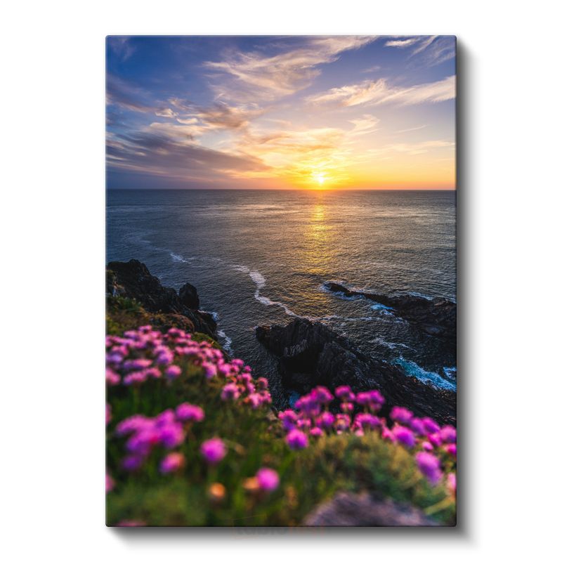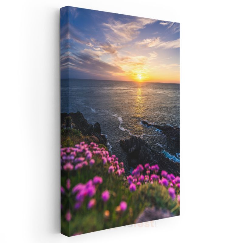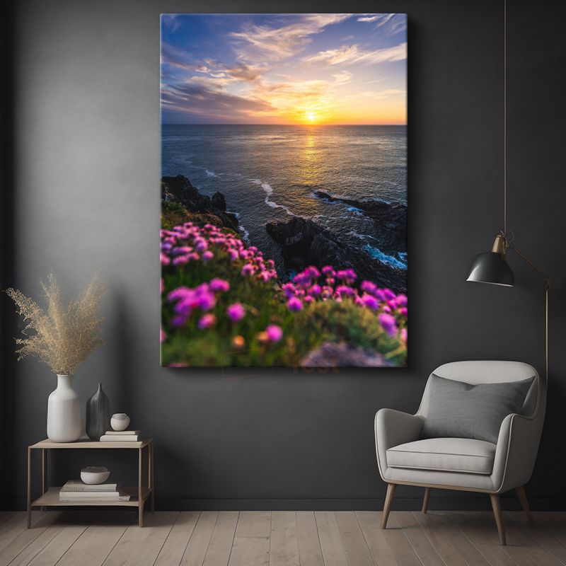 Okyanus Günbatımı - Pembe Çiçekli Sahil Kanvas Tablo