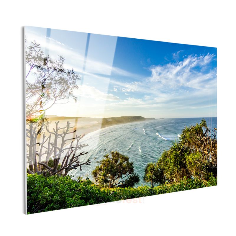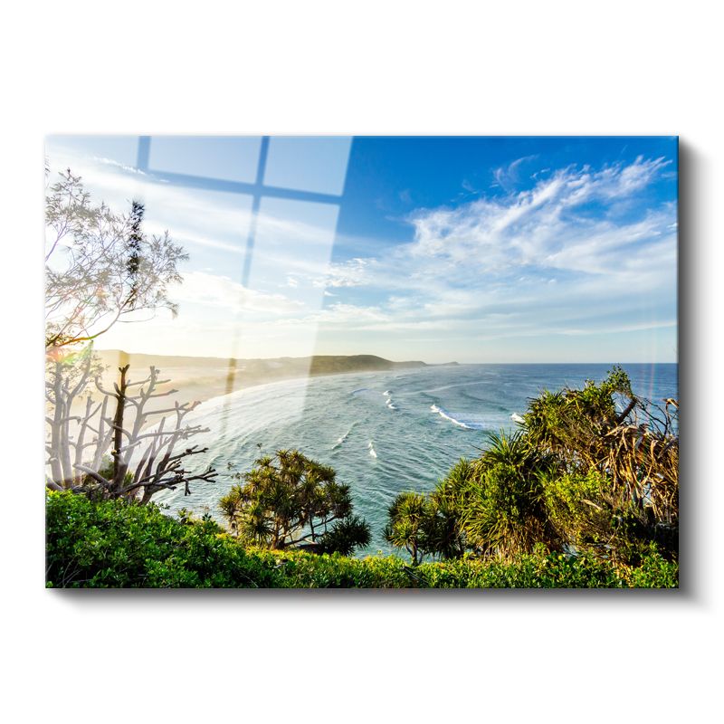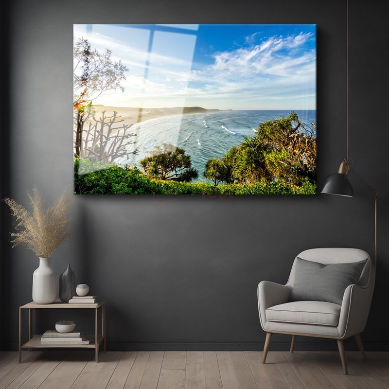 Okyanus Kıyısı - Turkuaz Dalgalar ve Yeşil Doğa Cam Tablo