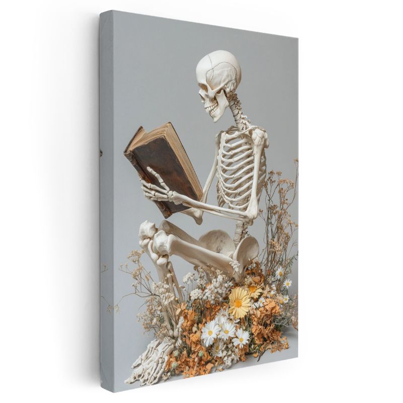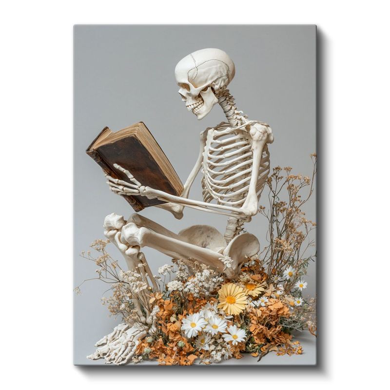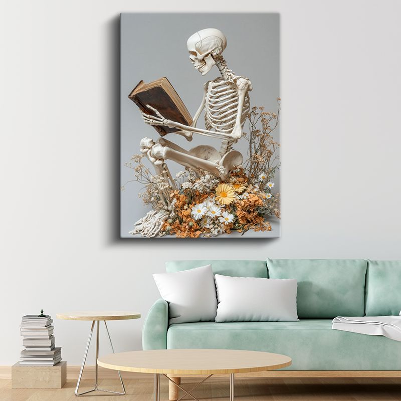 Ölümsüz Okur - Çiçekler Arasında Bilgelik Arayan İskelet Kanvas Tablo