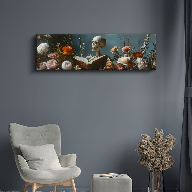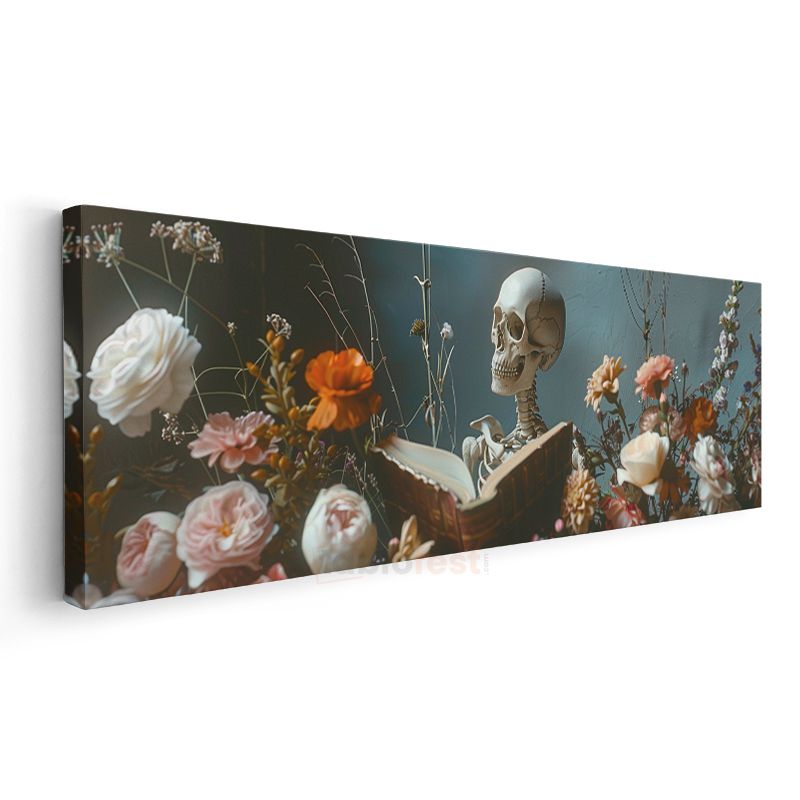 Ölümsüz Okuyucu - Çiçekler Arasında Bilgelik Arayan İskelet Kanvas Tablo
